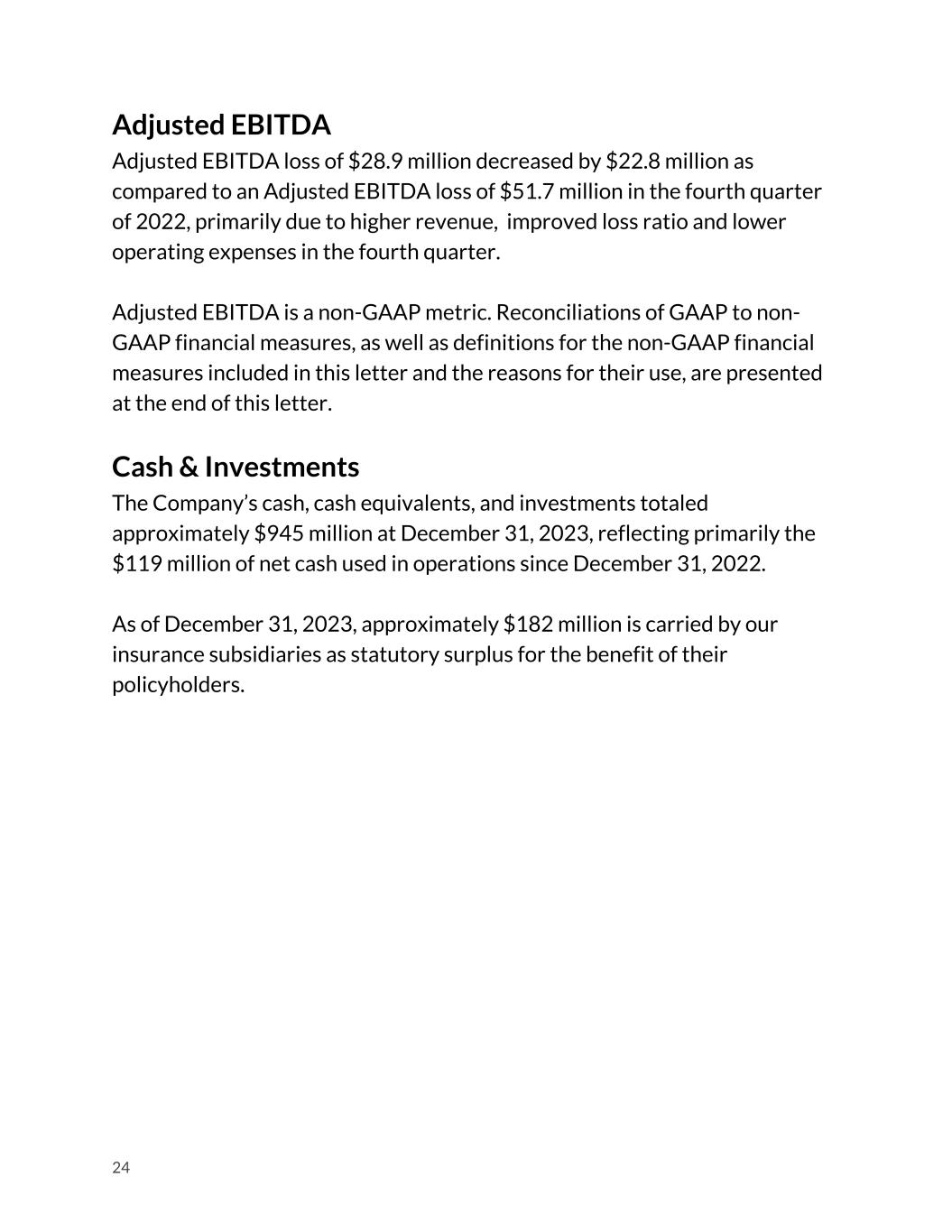 Adjusted EBITDA Adjusted EBITDA loss of $28.9 million decreased by $22.8 million as compared to an Adjusted EBITDA loss of $51.7 million in the fourth quarter of 2022, primarily due to higher revenue, improved loss ratio and lower operating expenses in the fourth quarter. Adjusted EBITDA is a non-GAAP metric. Reconciliations of GAAP to non- GAAP financial measures, as well as definitions for the non-GAAP financial measures included in this letter and the reasons for their use, are presented at the end of this letter. Cash & Investments The Company’s cash, cash equivalents, and investments totaled approximately $945 million at December 31, 2023, reflecting primarily the $119 million of net cash used in operations since December 31, 2022. As of December 31, 2023, approximately $182 million is carried by our insurance subsidiaries as statutory surplus for the benefit of their policyholders. 24