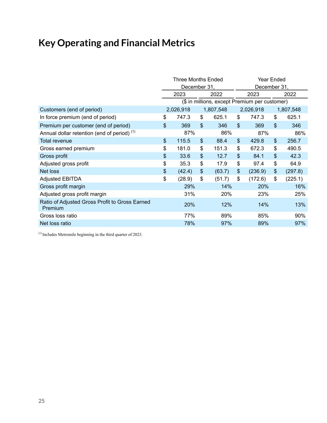 Key Operating and Financial Metrics Three Months Ended December 31, Year Ended December 31, 2023 2022 2023 2022 ($ in millions, except Premium per customer) Customers (end of period) 2,026,918 1,807,548 2,026,918 1,807,548 In force premium (end of period) $ 747.3 $ 625.1 $ 747.3 $ 625.1 Premium per customer (end of period) $ 369 $ 346 $ 369 $ 346 Annual dollar retention (end of period) (1) 87% 86% 87% 86% Total revenue $ 115.5 $ 88.4 $ 429.8 $ 256.7 Gross earned premium $ 181.0 $ 151.3 $ 672.3 $ 490.5 Gross profit $ 33.6 $ 12.7 $ 84.1 $ 42.3 Adjusted gross profit $ 35.3 $ 17.9 $ 97.4 $ 64.9 Net loss $ (42.4) $ (63.7) $ (236.9) $ (297.8) Adjusted EBITDA $ (28.9) $ (51.7) $ (172.6) $ (225.1) Gross profit margin 29% 14% 20% 16% Adjusted gross profit margin 31% 20% 23% 25% Ratio of Adjusted Gross Profit to Gross Earned Premium 20% 12% 14% 13% Gross loss ratio 77% 89% 85% 90% Net loss ratio 78% 97% 89% 97% (1) Includes Metromile beginning in the third quarter of 2023. 25