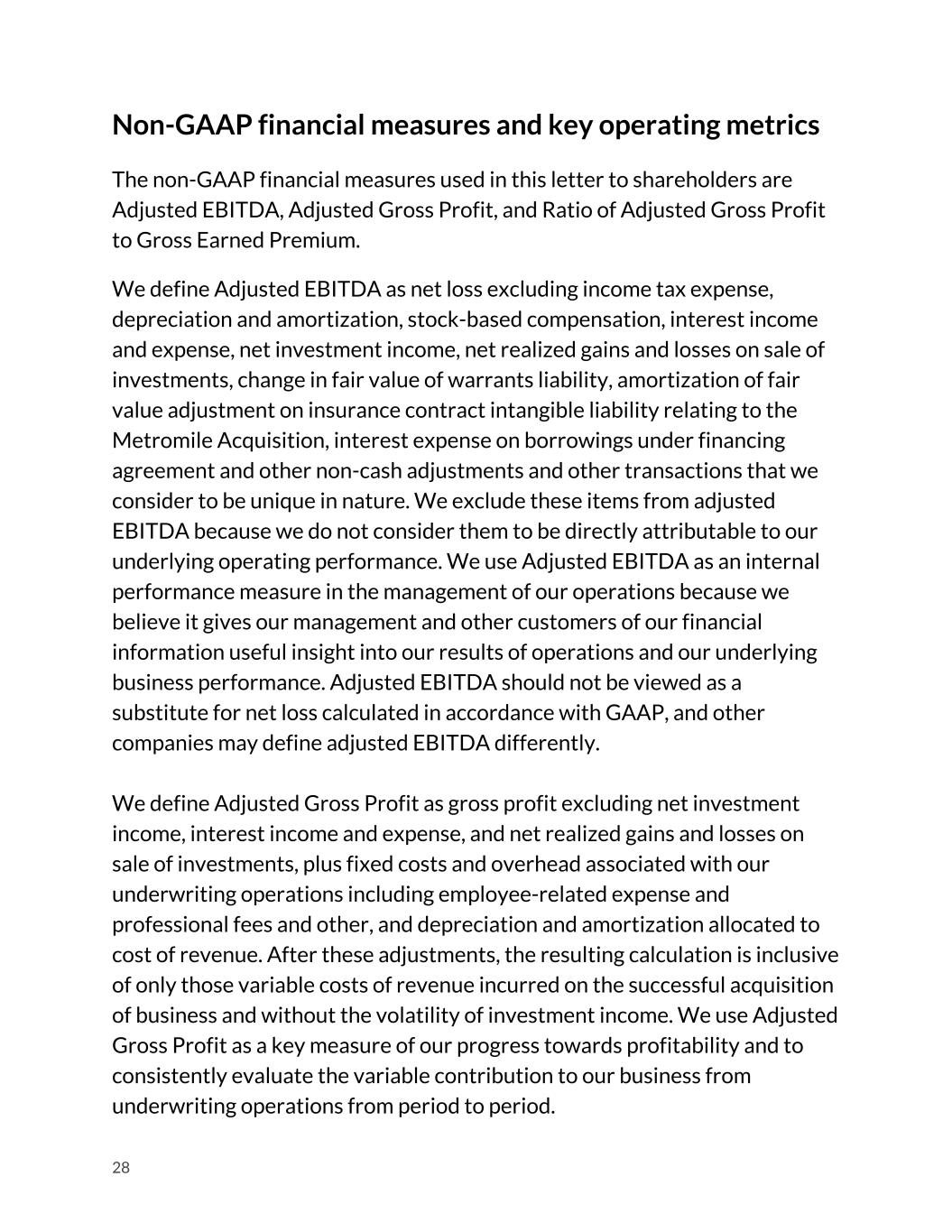 Non-GAAP financial measures and key operating metrics The non-GAAP financial measures used in this letter to shareholders are Adjusted EBITDA, Adjusted Gross Profit, and Ratio of Adjusted Gross Profit to Gross Earned Premium. We define Adjusted EBITDA as net loss excluding income tax expense, depreciation and amortization, stock-based compensation, interest income and expense, net investment income, net realized gains and losses on sale of investments, change in fair value of warrants liability, amortization of fair value adjustment on insurance contract intangible liability relating to the Metromile Acquisition, interest expense on borrowings under financing agreement and other non-cash adjustments and other transactions that we consider to be unique in nature. We exclude these items from adjusted EBITDA because we do not consider them to be directly attributable to our underlying operating performance. We use Adjusted EBITDA as an internal performance measure in the management of our operations because we believe it gives our management and other customers of our financial information useful insight into our results of operations and our underlying business performance. Adjusted EBITDA should not be viewed as a substitute for net loss calculated in accordance with GAAP, and other companies may define adjusted EBITDA differently. We define Adjusted Gross Profit as gross profit excluding net investment income, interest income and expense, and net realized gains and losses on sale of investments, plus fixed costs and overhead associated with our underwriting operations including employee-related expense and professional fees and other, and depreciation and amortization allocated to cost of revenue. After these adjustments, the resulting calculation is inclusive of only those variable costs of revenue incurred on the successful acquisition of business and without the volatility of investment income. We use Adjusted Gross Profit as a key measure of our progress towards profitability and to consistently evaluate the variable contribution to our business from underwriting operations from period to period. 28