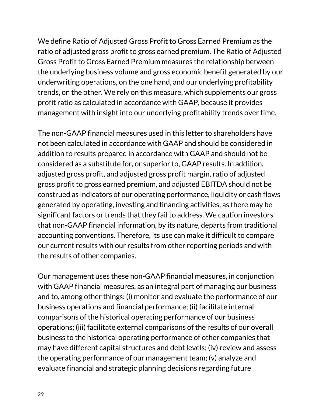 We define Ratio of Adjusted Gross Profit to Gross Earned Premium as the ratio of adjusted gross profit to gross earned premium. The Ratio of Adjusted Gross Profit to Gross Earned Premium measures the relationship between the underlying business volume and gross economic benefit generated by our underwriting operations, on the one hand, and our underlying profitability trends, on the other. We rely on this measure, which supplements our gross profit ratio as calculated in accordance with GAAP, because it provides management with insight into our underlying profitability trends over time. The non-GAAP financial measures used in this letter to shareholders have not been calculated in accordance with GAAP and should be considered in addition to results prepared in accordance with GAAP and should not be considered as a substitute for, or superior to, GAAP results. In addition, adjusted gross profit, and adjusted gross profit margin, ratio of adjusted gross profit to gross earned premium, and adjusted EBITDA should not be construed as indicators of our operating performance, liquidity or cash flows generated by operating, investing and financing activities, as there may be significant factors or trends that they fail to address. We caution investors that non-GAAP financial information, by its nature, departs from traditional accounting conventions. Therefore, its use can make it difficult to compare our current results with our results from other reporting periods and with the results of other companies. Our management uses these non-GAAP financial measures, in conjunction with GAAP financial measures, as an integral part of managing our business and to, among other things: (i) monitor and evaluate the performance of our business operations and financial performance; (ii) facilitate internal comparisons of the historical operating performance of our business operations; (iii) facilitate external comparisons of the results of our overall business to the historical operating performance of other companies that may have different capital structures and debt levels; (iv) review and assess the operating performance of our management team; (v) analyze and evaluate financial and strategic planning decisions regarding future 29