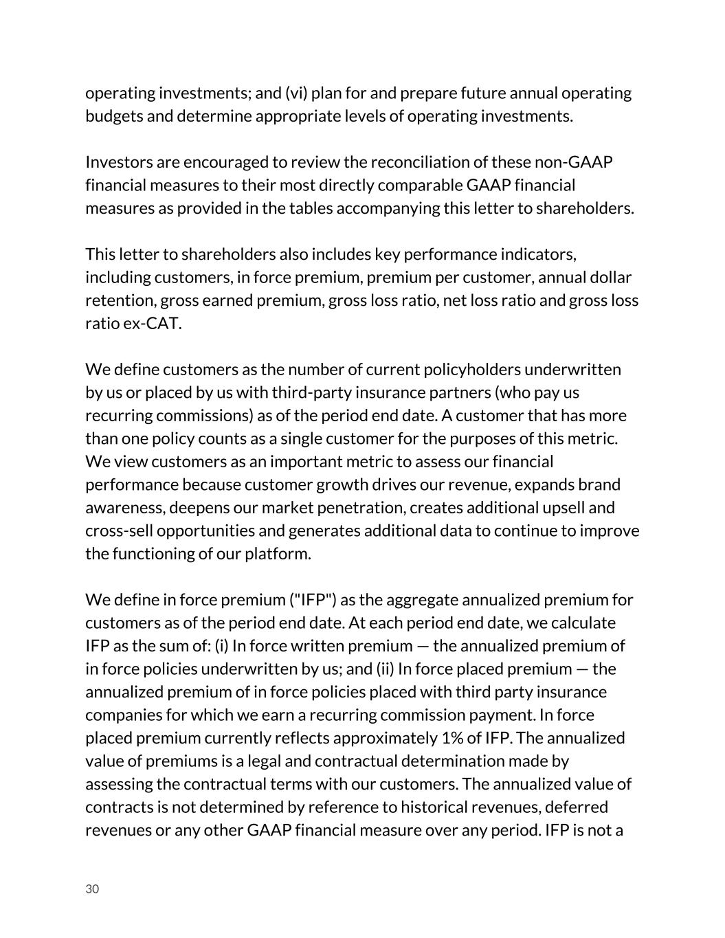operating investments; and (vi) plan for and prepare future annual operating budgets and determine appropriate levels of operating investments. Investors are encouraged to review the reconciliation of these non-GAAP financial measures to their most directly comparable GAAP financial measures as provided in the tables accompanying this letter to shareholders. This letter to shareholders also includes key performance indicators, including customers, in force premium, premium per customer, annual dollar retention, gross earned premium, gross loss ratio, net loss ratio and gross loss ratio ex-CAT. We define customers as the number of current policyholders underwritten by us or placed by us with third-party insurance partners (who pay us recurring commissions) as of the period end date. A customer that has more than one policy counts as a single customer for the purposes of this metric. We view customers as an important metric to assess our financial performance because customer growth drives our revenue, expands brand awareness, deepens our market penetration, creates additional upsell and cross-sell opportunities and generates additional data to continue to improve the functioning of our platform. We define in force premium ("IFP") as the aggregate annualized premium for customers as of the period end date. At each period end date, we calculate IFP as the sum of: (i) In force written premium — the annualized premium of in force policies underwritten by us; and (ii) In force placed premium — the annualized premium of in force policies placed with third party insurance companies for which we earn a recurring commission payment. In force placed premium currently reflects approximately 1% of IFP. The annualized value of premiums is a legal and contractual determination made by assessing the contractual terms with our customers. The annualized value of contracts is not determined by reference to historical revenues, deferred revenues or any other GAAP financial measure over any period. IFP is not a 30