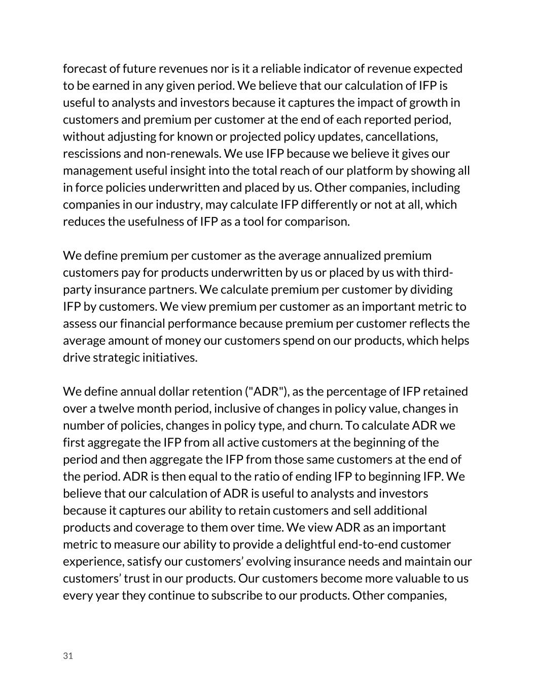 forecast of future revenues nor is it a reliable indicator of revenue expected to be earned in any given period. We believe that our calculation of IFP is useful to analysts and investors because it captures the impact of growth in customers and premium per customer at the end of each reported period, without adjusting for known or projected policy updates, cancellations, rescissions and non-renewals. We use IFP because we believe it gives our management useful insight into the total reach of our platform by showing all in force policies underwritten and placed by us. Other companies, including companies in our industry, may calculate IFP differently or not at all, which reduces the usefulness of IFP as a tool for comparison. We define premium per customer as the average annualized premium customers pay for products underwritten by us or placed by us with third- party insurance partners. We calculate premium per customer by dividing IFP by customers. We view premium per customer as an important metric to assess our financial performance because premium per customer reflects the average amount of money our customers spend on our products, which helps drive strategic initiatives. We define annual dollar retention ("ADR"), as the percentage of IFP retained over a twelve month period, inclusive of changes in policy value, changes in number of policies, changes in policy type, and churn. To calculate ADR we first aggregate the IFP from all active customers at the beginning of the period and then aggregate the IFP from those same customers at the end of the period. ADR is then equal to the ratio of ending IFP to beginning IFP. We believe that our calculation of ADR is useful to analysts and investors because it captures our ability to retain customers and sell additional products and coverage to them over time. We view ADR as an important metric to measure our ability to provide a delightful end-to-end customer experience, satisfy our customers’ evolving insurance needs and maintain our customers’ trust in our products. Our customers become more valuable to us every year they continue to subscribe to our products. Other companies, 31