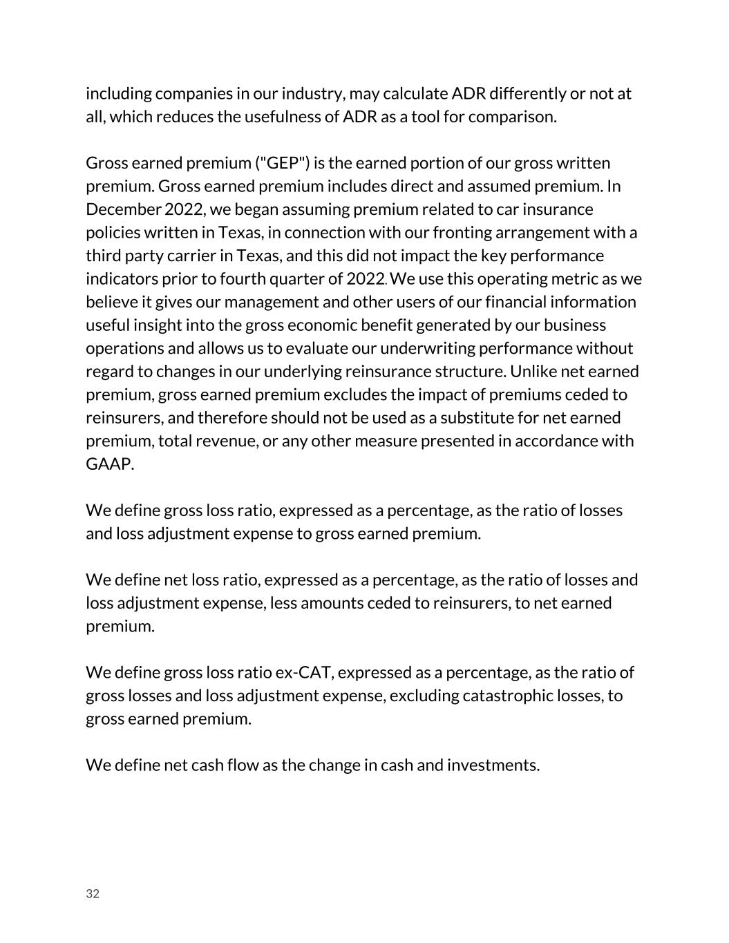 including companies in our industry, may calculate ADR differently or not at all, which reduces the usefulness of ADR as a tool for comparison. Gross earned premium ("GEP") is the earned portion of our gross written premium. Gross earned premium includes direct and assumed premium. In December 2022, we began assuming premium related to car insurance policies written in Texas, in connection with our fronting arrangement with a third party carrier in Texas, and this did not impact the key performance indicators prior to fourth quarter of 2022. We use this operating metric as we believe it gives our management and other users of our financial information useful insight into the gross economic benefit generated by our business operations and allows us to evaluate our underwriting performance without regard to changes in our underlying reinsurance structure. Unlike net earned premium, gross earned premium excludes the impact of premiums ceded to reinsurers, and therefore should not be used as a substitute for net earned premium, total revenue, or any other measure presented in accordance with GAAP. We define gross loss ratio, expressed as a percentage, as the ratio of losses and loss adjustment expense to gross earned premium. We define net loss ratio, expressed as a percentage, as the ratio of losses and loss adjustment expense, less amounts ceded to reinsurers, to net earned premium. We define gross loss ratio ex-CAT, expressed as a percentage, as the ratio of gross losses and loss adjustment expense, excluding catastrophic losses, to gross earned premium. We define net cash flow as the change in cash and investments. 32