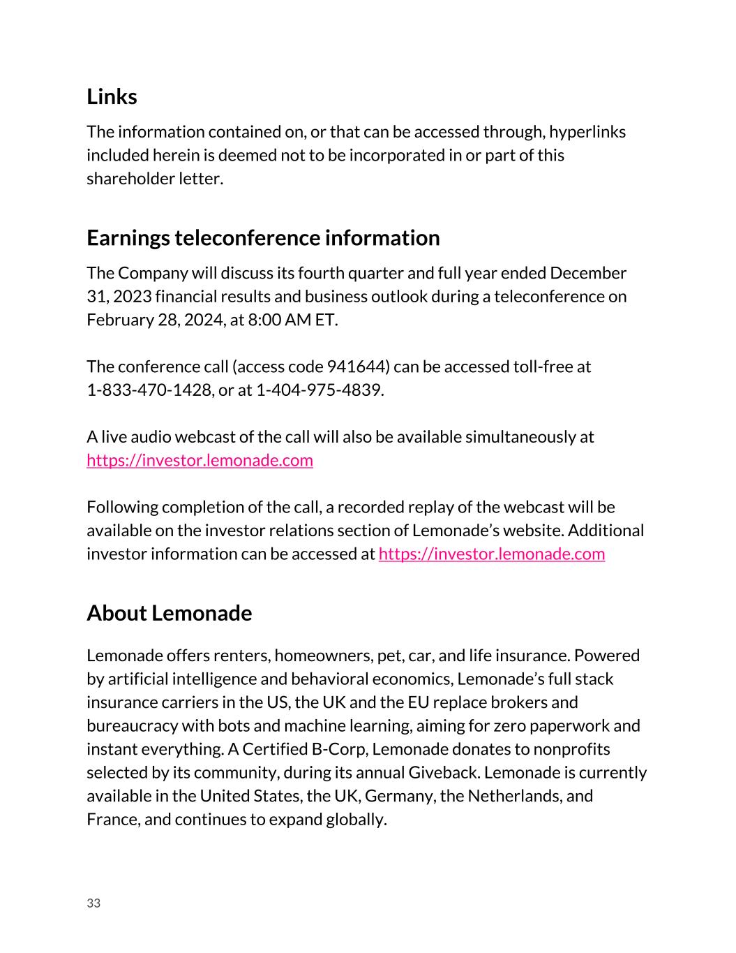 Links The information contained on, or that can be accessed through, hyperlinks included herein is deemed not to be incorporated in or part of this shareholder letter. Earnings teleconference information The Company will discuss its fourth quarter and full year ended December 31, 2023 financial results and business outlook during a teleconference on February 28, 2024, at 8:00 AM ET. The conference call (access code 941644) can be accessed toll-free at 1-833-470-1428, or at 1-404-975-4839. A live audio webcast of the call will also be available simultaneously at https://investor.lemonade.com Following completion of the call, a recorded replay of the webcast will be available on the investor relations section of Lemonade’s website. Additional investor information can be accessed at https://investor.lemonade.com About Lemonade Lemonade offers renters, homeowners, pet, car, and life insurance. Powered by artificial intelligence and behavioral economics, Lemonade’s full stack insurance carriers in the US, the UK and the EU replace brokers and bureaucracy with bots and machine learning, aiming for zero paperwork and instant everything. A Certified B-Corp, Lemonade donates to nonprofits selected by its community, during its annual Giveback. Lemonade is currently available in the United States, the UK, Germany, the Netherlands, and France, and continues to expand globally. 33
