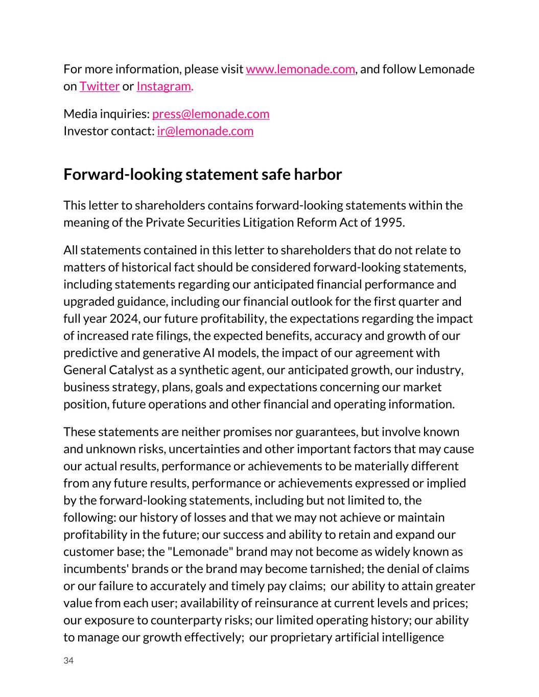 For more information, please visit www.lemonade.com, and follow Lemonade on Twitter or Instagram. Media inquiries: press@lemonade.com Investor contact: ir@lemonade.com Forward-looking statement safe harbor This letter to shareholders contains forward-looking statements within the meaning of the Private Securities Litigation Reform Act of 1995. All statements contained in this letter to shareholders that do not relate to matters of historical fact should be considered forward-looking statements, including statements regarding our anticipated financial performance and upgraded guidance, including our financial outlook for the first quarter and full year 2024, our future profitability, the expectations regarding the impact of increased rate filings, the expected benefits, accuracy and growth of our predictive and generative AI models, the impact of our agreement with General Catalyst as a synthetic agent, our anticipated growth, our industry, business strategy, plans, goals and expectations concerning our market position, future operations and other financial and operating information. These statements are neither promises nor guarantees, but involve known and unknown risks, uncertainties and other important factors that may cause our actual results, performance or achievements to be materially different from any future results, performance or achievements expressed or implied by the forward-looking statements, including but not limited to, the following: our history of losses and that we may not achieve or maintain profitability in the future; our success and ability to retain and expand our customer base; the "Lemonade" brand may not become as widely known as incumbents' brands or the brand may become tarnished; the denial of claims or our failure to accurately and timely pay claims; our ability to attain greater value from each user; availability of reinsurance at current levels and prices; our exposure to counterparty risks; our limited operating history; our ability to manage our growth effectively; our proprietary artificial intelligence 34