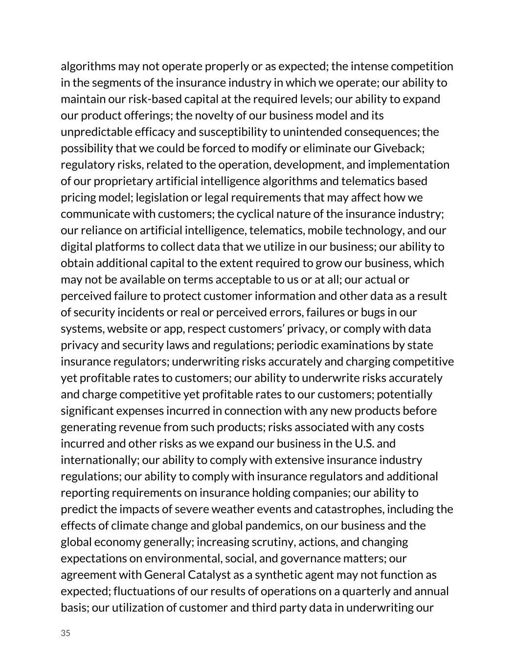 algorithms may not operate properly or as expected; the intense competition in the segments of the insurance industry in which we operate; our ability to maintain our risk-based capital at the required levels; our ability to expand our product offerings; the novelty of our business model and its unpredictable efficacy and susceptibility to unintended consequences; the possibility that we could be forced to modify or eliminate our Giveback; regulatory risks, related to the operation, development, and implementation of our proprietary artificial intelligence algorithms and telematics based pricing model; legislation or legal requirements that may affect how we communicate with customers; the cyclical nature of the insurance industry; our reliance on artificial intelligence, telematics, mobile technology, and our digital platforms to collect data that we utilize in our business; our ability to obtain additional capital to the extent required to grow our business, which may not be available on terms acceptable to us or at all; our actual or perceived failure to protect customer information and other data as a result of security incidents or real or perceived errors, failures or bugs in our systems, website or app, respect customers’ privacy, or comply with data privacy and security laws and regulations; periodic examinations by state insurance regulators; underwriting risks accurately and charging competitive yet profitable rates to customers; our ability to underwrite risks accurately and charge competitive yet profitable rates to our customers; potentially significant expenses incurred in connection with any new products before generating revenue from such products; risks associated with any costs incurred and other risks as we expand our business in the U.S. and internationally; our ability to comply with extensive insurance industry regulations; our ability to comply with insurance regulators and additional reporting requirements on insurance holding companies; our ability to predict the impacts of severe weather events and catastrophes, including the effects of climate change and global pandemics, on our business and the global economy generally; increasing scrutiny, actions, and changing expectations on environmental, social, and governance matters; our agreement with General Catalyst as a synthetic agent may not function as expected; fluctuations of our results of operations on a quarterly and annual basis; our utilization of customer and third party data in underwriting our 35