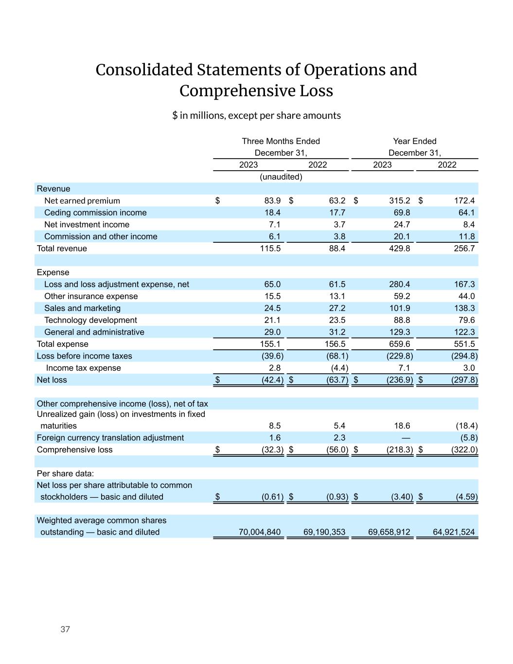 Consolidated Statements of Operations and Comprehensive Loss $ in millions, except per share amounts Three Months Ended December 31, Year Ended December 31, 2023 2022 2023 2022 (unaudited) Revenue Net earned premium $ 83.9 $ 63.2 $ 315.2 $ 172.4 Ceding commission income 18.4 17.7 69.8 64.1 Net investment income 7.1 3.7 24.7 8.4 Commission and other income 6.1 3.8 20.1 11.8 Total revenue 115.5 88.4 429.8 256.7 Expense Loss and loss adjustment expense, net 65.0 61.5 280.4 167.3 Other insurance expense 15.5 13.1 59.2 44.0 Sales and marketing 24.5 27.2 101.9 138.3 Technology development 21.1 23.5 88.8 79.6 General and administrative 29.0 31.2 129.3 122.3 Total expense 155.1 156.5 659.6 551.5 Loss before income taxes (39.6) (68.1) (229.8) (294.8) Income tax expense 2.8 (4.4) 7.1 3.0 Net loss $ (42.4) $ (63.7) $ (236.9) $ (297.8) Other comprehensive income (loss), net of tax Unrealized gain (loss) on investments in fixed maturities 8.5 5.4 18.6 (18.4) Foreign currency translation adjustment 1.6 2.3 — (5.8) Comprehensive loss $ (32.3) $ (56.0) $ (218.3) $ (322.0) Per share data: Net loss per share attributable to common stockholders — basic and diluted $ (0.61) $ (0.93) $ (3.40) $ (4.59) Weighted average common shares outstanding — basic and diluted 70,004,840 69,190,353 69,658,912 64,921,524 37