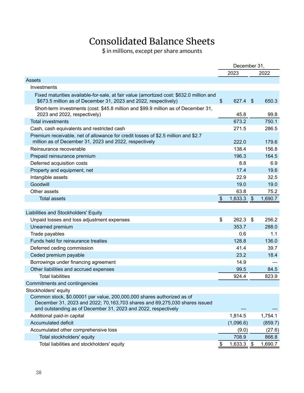 Consolidated Balance Sheets $ in millions, except per share amounts December 31, 2023 2022 Assets Investments Fixed maturities available-for-sale, at fair value (amortized cost: $632.0 million and $673.5 million as of December 31, 2023 and 2022, respectively) $ 627.4 $ 650.3 Short-term investments (cost: $45.8 million and $99.9 million as of December 31, 2023 and 2022, respectively) 45.8 99.8 Total investments 673.2 750.1 Cash, cash equivalents and restricted cash 271.5 286.5 Premium receivable, net of allowance for credit losses of $2.5 million and $2.7 million as of December 31, 2023 and 2022, respectively 222.0 179.6 Reinsurance recoverable 138.4 156.8 Prepaid reinsurance premium 196.3 164.5 Deferred acquisition costs 8.8 6.9 Property and equipment, net 17.4 19.6 Intangible assets 22.9 32.5 Goodwill 19.0 19.0 Other assets 63.8 75.2 Total assets $ 1,633.3 $ 1,690.7 Liabilities and Stockholders' Equity Unpaid losses and loss adjustment expenses $ 262.3 $ 256.2 Unearned premium 353.7 288.0 Trade payables 0.6 1.1 Funds held for reinsurance treaties 128.8 136.0 Deferred ceding commission 41.4 39.7 Ceded premium payable 23.2 18.4 Borrowings under financing agreement 14.9 — Other liabilities and accrued expenses 99.5 84.5 Total liabilities 924.4 823.9 Commitments and contingencies Stockholders' equity Common stock, $0.00001 par value, 200,000,000 shares authorized as of December 31, 2023 and 2022; 70,163,703 shares and 69,275,030 shares issued and outstanding as of December 31, 2023 and 2022, respectively — — Additional paid-in capital 1,814.5 1,754.1 Accumulated deficit (1,096.6) (859.7) Accumulated other comprehensive loss (9.0) (27.6) Total stockholders' equity 708.9 866.8 Total liabilities and stockholders' equity $ 1,633.3 $ 1,690.7 38