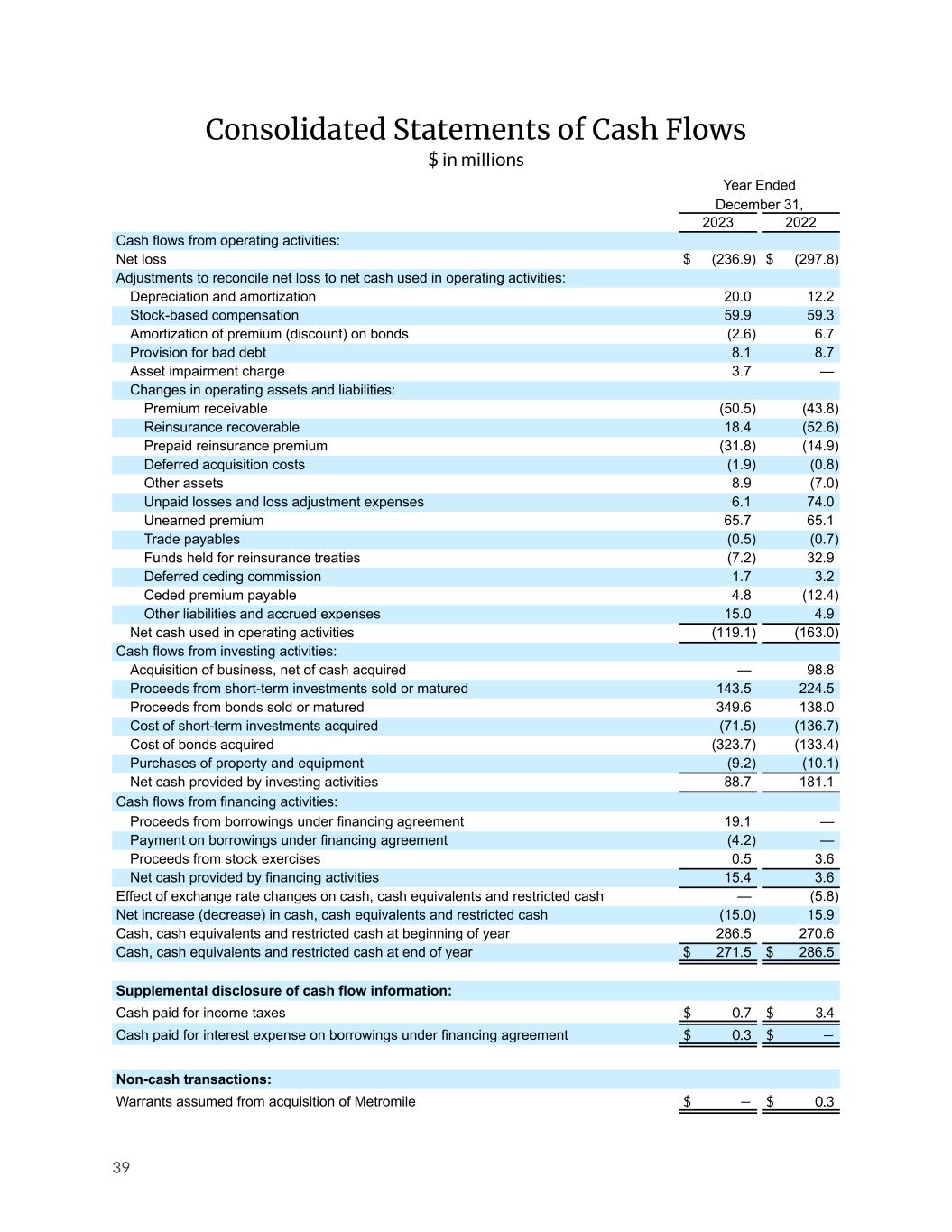 Consolidated Statements of Cash Flows $ in millions Year Ended December 31, 2023 2022 Cash flows from operating activities: Net loss $ (236.9) $ (297.8) Adjustments to reconcile net loss to net cash used in operating activities: Depreciation and amortization 20.0 12.2 Stock-based compensation 59.9 59.3 Amortization of premium (discount) on bonds (2.6) 6.7 Provision for bad debt 8.1 8.7 Asset impairment charge 3.7 — Changes in operating assets and liabilities: Premium receivable (50.5) (43.8) Reinsurance recoverable 18.4 (52.6) Prepaid reinsurance premium (31.8) (14.9) Deferred acquisition costs (1.9) (0.8) Other assets 8.9 (7.0) Unpaid losses and loss adjustment expenses 6.1 74.0 Unearned premium 65.7 65.1 Trade payables (0.5) (0.7) Funds held for reinsurance treaties (7.2) 32.9 Deferred ceding commission 1.7 3.2 Ceded premium payable 4.8 (12.4) Other liabilities and accrued expenses 15.0 4.9 Net cash used in operating activities (119.1) (163.0) Cash flows from investing activities: Acquisition of business, net of cash acquired — 98.8 Proceeds from short-term investments sold or matured 143.5 224.5 Proceeds from bonds sold or matured 349.6 138.0 Cost of short-term investments acquired (71.5) (136.7) Cost of bonds acquired (323.7) (133.4) Purchases of property and equipment (9.2) (10.1) Net cash provided by investing activities 88.7 181.1 Cash flows from financing activities: Proceeds from borrowings under financing agreement 19.1 — Payment on borrowings under financing agreement (4.2) — Proceeds from stock exercises 0.5 3.6 Net cash provided by financing activities 15.4 3.6 Effect of exchange rate changes on cash, cash equivalents and restricted cash — (5.8) Net increase (decrease) in cash, cash equivalents and restricted cash (15.0) 15.9 Cash, cash equivalents and restricted cash at beginning of year 286.5 270.6 Cash, cash equivalents and restricted cash at end of year $ 271.5 $ 286.5 Supplemental disclosure of cash flow information: Cash paid for income taxes $ 0.7 $ 3.4 Cash paid for interest expense on borrowings under financing agreement $ 0.3 $ — Non-cash transactions: Warrants assumed from acquisition of Metromile $ — $ 0.3 39