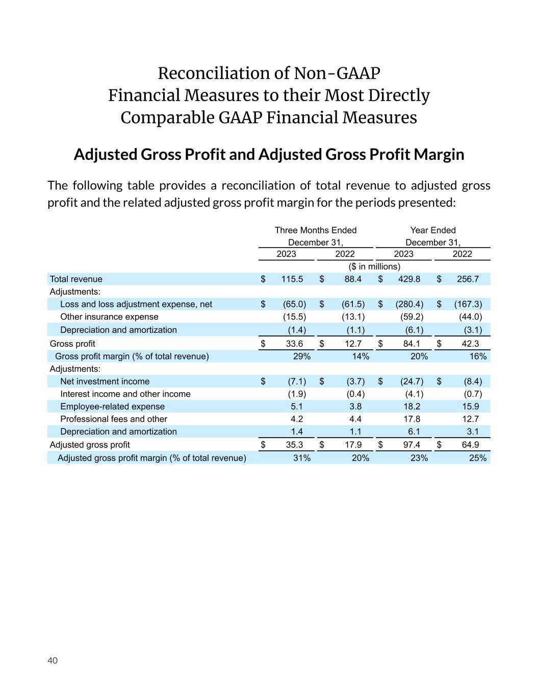Reconciliation of Non-GAAP Financial Measures to their Most Directly Comparable GAAP Financial Measures Adjusted Gross Profit and Adjusted Gross Profit Margin The following table provides a reconciliation of total revenue to adjusted gross profit and the related adjusted gross profit margin for the periods presented: Three Months Ended December 31, Year Ended December 31, 2023 2022 2023 2022 ($ in millions) Total revenue $ 115.5 $ 88.4 $ 429.8 $ 256.7 Adjustments: Loss and loss adjustment expense, net $ (65.0) $ (61.5) $ (280.4) $ (167.3) Other insurance expense (15.5) (13.1) (59.2) (44.0) Depreciation and amortization (1.4) (1.1) (6.1) (3.1) Gross profit $ 33.6 $ 12.7 $ 84.1 $ 42.3 Gross profit margin (% of total revenue) 29% 14% 20% 16% Adjustments: Net investment income $ (7.1) $ (3.7) $ (24.7) $ (8.4) Interest income and other income (1.9) (0.4) (4.1) (0.7) Employee-related expense 5.1 3.8 18.2 15.9 Professional fees and other 4.2 4.4 17.8 12.7 Depreciation and amortization 1.4 1.1 6.1 3.1 Adjusted gross profit $ 35.3 $ 17.9 $ 97.4 $ 64.9 Adjusted gross profit margin (% of total revenue) 31% 20% 23% 25% 40