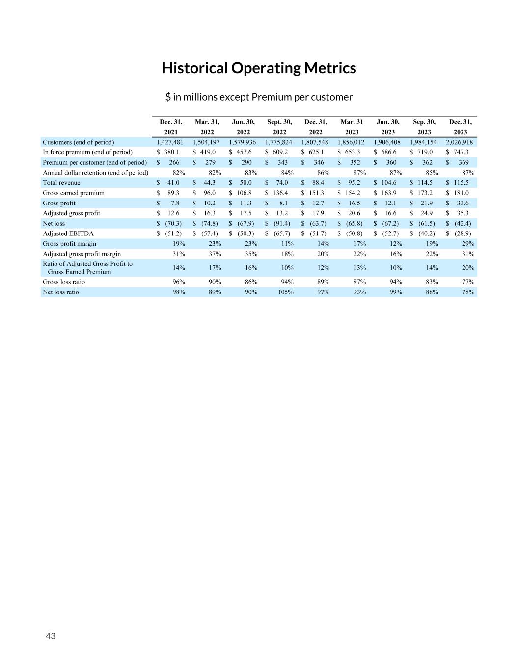 Historical Operating Metrics $ in millions except Premium per customer Dec. 31, Mar. 31, Jun. 30, Sept. 30, Dec. 31, Mar. 31 Jun. 30, Sep. 30, Dec. 31, 2021 2022 2022 2022 2022 2023 2023 2023 2023 Customers (end of period) 1,427,481 1,504,197 1,579,936 1,775,824 1,807,548 1,856,012 1,906,408 1,984,154 2,026,918 In force premium (end of period) $ 380.1 $ 419.0 $ 457.6 $ 609.2 $ 625.1 $ 653.3 $ 686.6 $ 719.0 $ 747.3 Premium per customer (end of period) $ 266 $ 279 $ 290 $ 343 $ 346 $ 352 $ 360 $ 362 $ 369 Annual dollar retention (end of period) 82% 82% 83% 84% 86% 87% 87% 85% 87% Total revenue $ 41.0 $ 44.3 $ 50.0 $ 74.0 $ 88.4 $ 95.2 $ 104.6 $ 114.5 $ 115.5 Gross earned premium $ 89.3 $ 96.0 $ 106.8 $ 136.4 $ 151.3 $ 154.2 $ 163.9 $ 173.2 $ 181.0 Gross profit $ 7.8 $ 10.2 $ 11.3 $ 8.1 $ 12.7 $ 16.5 $ 12.1 $ 21.9 $ 33.6 Adjusted gross profit $ 12.6 $ 16.3 $ 17.5 $ 13.2 $ 17.9 $ 20.6 $ 16.6 $ 24.9 $ 35.3 Net loss $ (70.3) $ (74.8) $ (67.9) $ (91.4) $ (63.7) $ (65.8) $ (67.2) $ (61.5) $ (42.4) Adjusted EBITDA $ (51.2) $ (57.4) $ (50.3) $ (65.7) $ (51.7) $ (50.8) $ (52.7) $ (40.2) $ (28.9) Gross profit margin 19% 23% 23% 11% 14% 17% 12% 19% 29% Adjusted gross profit margin 31% 37% 35% 18% 20% 22% 16% 22% 31% Ratio of Adjusted Gross Profit to Gross Earned Premium 14% 17% 16% 10% 12% 13% 10% 14% 20% Gross loss ratio 96% 90% 86% 94% 89% 87% 94% 83% 77% Net loss ratio 98% 89% 90% 105% 97% 93% 99% 88% 78% 43