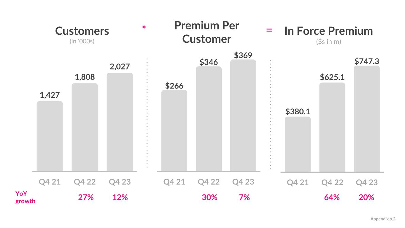 Customers (in ‘000s) In Force Premium ($s in m) 12% 27% YoY growth 20%64% 1,427 1,808 2,027 Q4 21 Q4 22 Q4 23 $380.1 $625.1 $747.3 Q4 21 Q4 22 Q4 23 $266 $346 $369 Q4 21 Q4 22 Q4 23 Premium Per Customer 7% 30% * = Appendix p.2