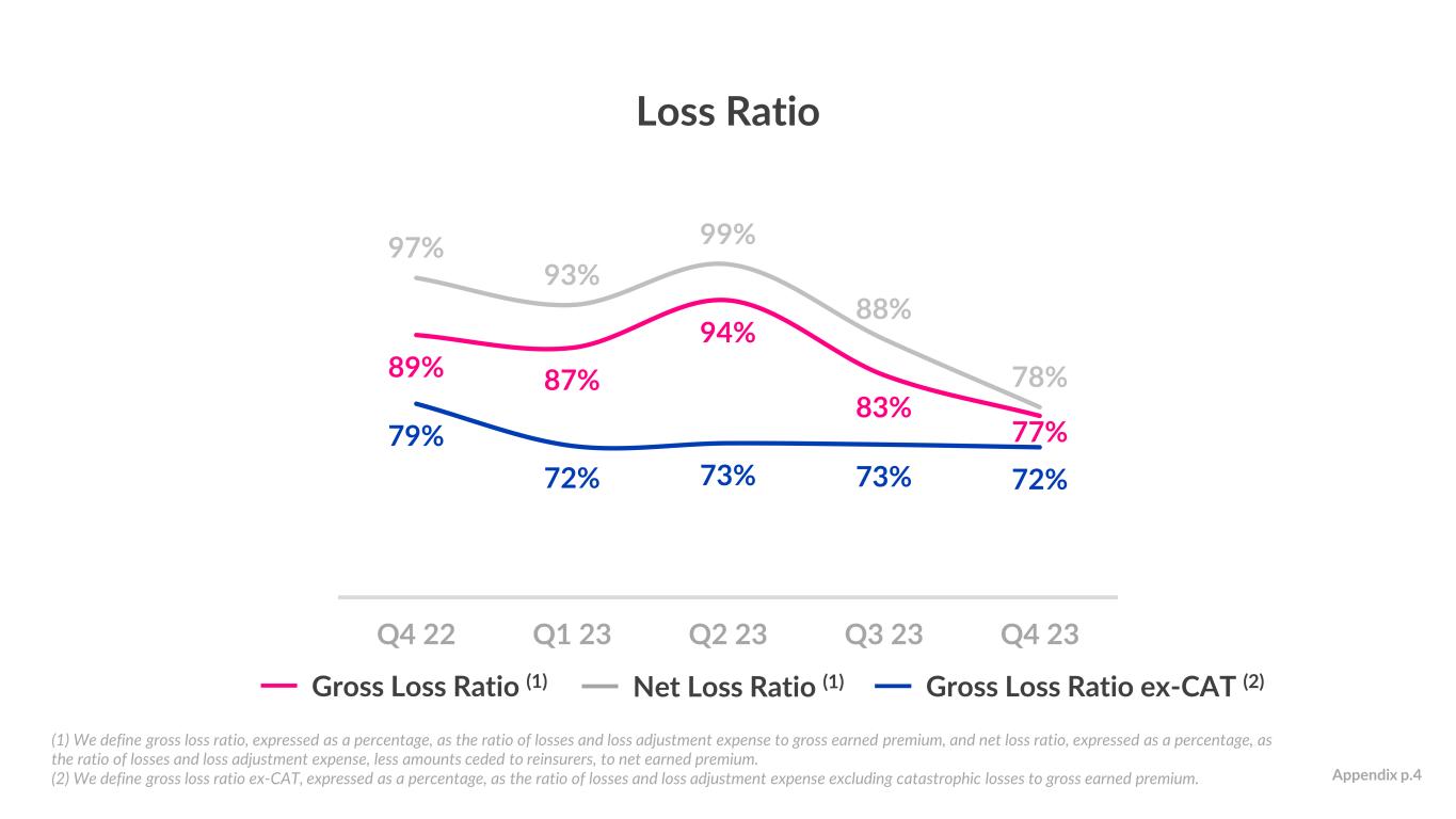 Gross Earned Premium (“GEP”) ($s in m) Revenue ($s in m) $41.0 $88.4 $115.5 Q4 21 Q4 22 Q4 23 31%116%YoY growth $89.3 $151.3 $181.0 Q4 21 Q4 22 Q4 23 20% 69% Appendix p.3