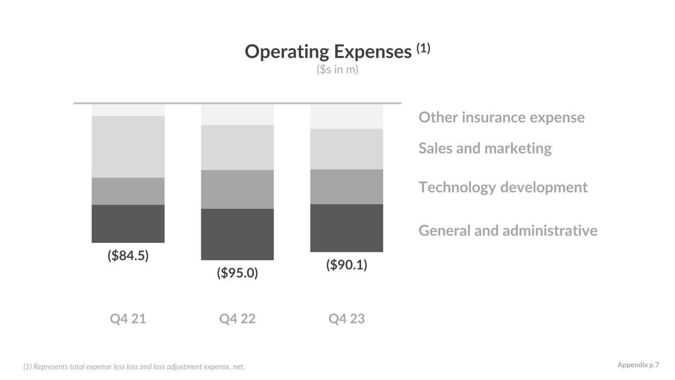 ($84.5) ($95.0) ($90.1) Q4 21 Q4 22 Q4 23 Other insurance expense Sales and marketing Technology development General and administrative Operating Expenses (1) ($s in m) (1) Represents total expense less loss and loss adjustment expense, net. Appendix p.7