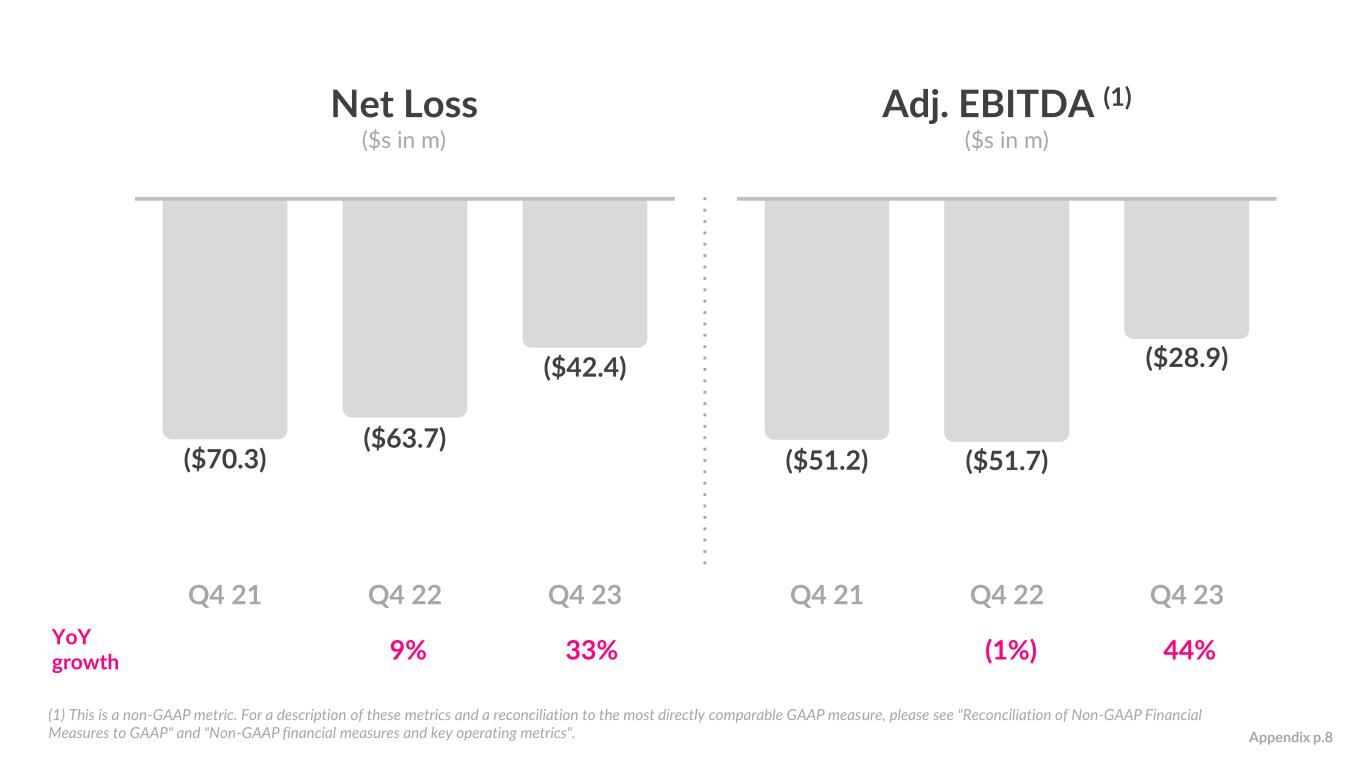 Net Loss ($s in m) Adj. EBITDA (1) ($s in m) 44%(1%) YoY growth 33% 9% (1) This is a non-GAAP metric. For a description of these metrics and a reconciliation to the most directly comparable GAAP measure, please see "Reconciliation of Non-GAAP Financial Measures to GAAP" and "Non-GAAP financial measures and key operating metrics". Appendix p.8 ($70.3) ($63.7) ($42.4) Q4 21 Q4 22 Q4 23 ($51.2) ($51.7) ($28.9) Q4 21 Q4 22 Q4 23