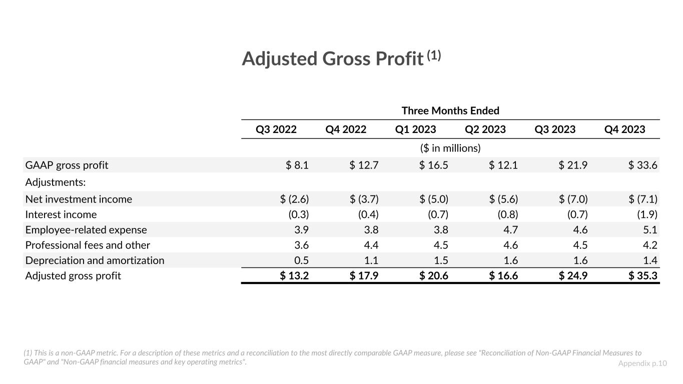 Adjusted Gross Profit (1) (1) This is a non-GAAP metric. For a description of these metrics and a reconciliation to the most directly comparable GAAP measure, please see "Reconciliation of Non-GAAP Financial Measures to GAAP" and "Non-GAAP financial measures and key operating metrics". Three Months Ended Q3 2022 Q4 2022 Q1 2023 Q2 2023 Q3 2023 Q4 2023 ($ in millions) GAAP gross profit $ 8.1 $ 12.7 $ 16.5 $ 12.1 $ 21.9 $ 33.6 Adjustments: Net investment income $ (2.6) $ (3.7) $ (5.0) $ (5.6) $ (7.0) $ (7.1) Interest income (0.3) (0.4) (0.7) (0.8) (0.7) (1.9) Employee-related expense 3.9 3.8 3.8 4.7 4.6 5.1 Professional fees and other 3.6 4.4 4.5 4.6 4.5 4.2 Depreciation and amortization 0.5 1.1 1.5 1.6 1.6 1.4 Adjusted gross profit $ 13.2 $ 17.9 $ 20.6 $ 16.6 $ 24.9 $ 35.3 Appendix p.10