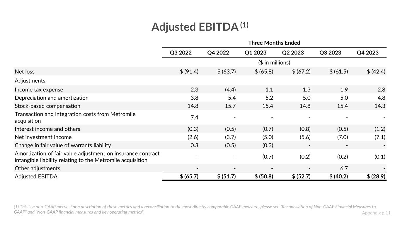 Adjusted EBITDA (1) (1) This is a non-GAAP metric. For a description of these metrics and a reconciliation to the most directly comparable GAAP measure, please see "Reconciliation of Non-GAAP Financial Measures to GAAP" and "Non-GAAP financial measures and key operating metrics". Three Months Ended Q3 2022 Q4 2022 Q1 2023 Q2 2023 Q3 2023 Q4 2023 ($ in millions) Net loss $ (91.4) $ (63.7) $ (65.8) $ (67.2) $ (61.5) $ (42.4) Adjustments: Income tax expense 2.3 (4.4) 1.1 1.3 1.9 2.8 Depreciation and amortization 3.8 5.4 5.2 5.0 5.0 4.8 Stock-based compensation 14.8 15.7 15.4 14.8 15.4 14.3 Transaction and integration costs from Metromile acquisition 7.4 - - - - - Interest income and others (0.3) (0.5) (0.7) (0.8) (0.5) (1.2) Net investment income (2.6) (3.7) (5.0) (5.6) (7.0) (7.1) Change in fair value of warrants liability 0.3 (0.5) (0.3) - - - Amortization of fair value adjustment on insurance contract intangible liability relating to the Metromile acquisition - - (0.7) (0.2) (0.2) (0.1) Other adjustments - - - - 6.7 - Adjusted EBITDA $ (65.7) $ (51.7) $ (50.8) $ (52.7) $ (40.2) $ (28.9) Appendix p.11