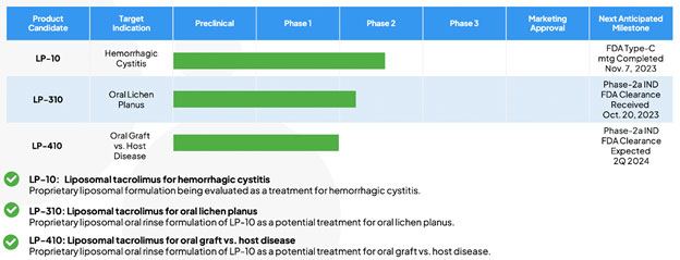 The safety and efficacy of LP-10 was evaluated in a 13-subject, open-label, multi-center, dose-escalation, phase 2a clinical trial in patients experiencing complications associated with a rare but highly morbid disease called “radiation-induced hemorrhagic cystitis” or “radiation cystitis.” This phase 2a clinical trial commenced on February 15, 2021, and we reported the trial’s summary results in the first quarter of 2023. There is currently no FDA approved drug therapy available for radiation cystitis patients, who are all cancer survivors who received pelvic radiation therapy to treat solid pelvic tumors, including prostate and ovarian cancers and who are now dealing with therapy-associated complications, including urinary bleeding (a radiation cystitis symptom). LP-10’s active ingredient, tacrolimus, which has a well-known pharmacology and toxicology, addresses a reduction (or cessation) of uncontrolled urinary bleeding.