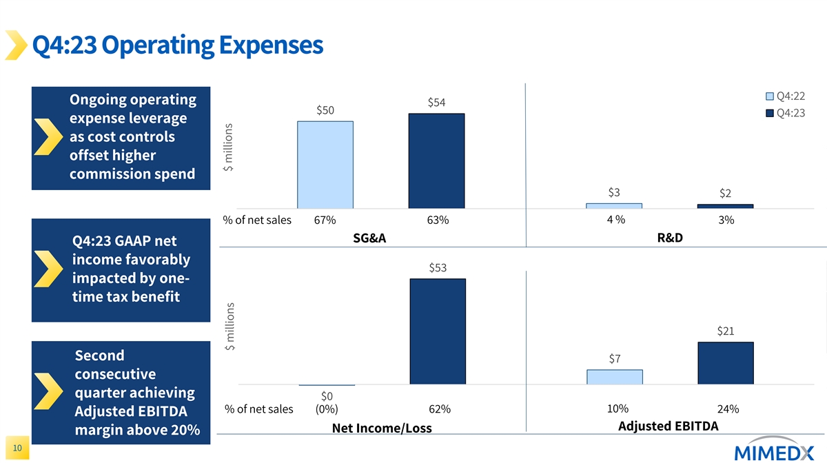 Q4:23 Gross Profit & Gross Margin Mix & Ongoing Improvements in Operations Driving Gross Margin Expansion 80 $73 Q4:23 gross profit improvement driven by higher net sales $60 84% Improvement in Q4:23 gross margins 81% led by product mix and production yield improvements 0 Q4:22 Q4:23 9 $ millions Gross Margin
