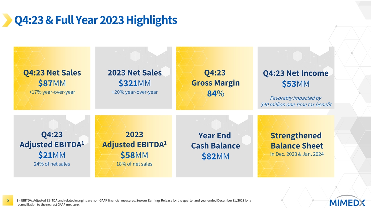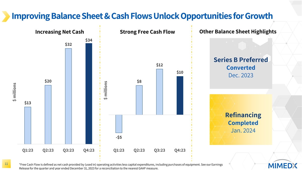 Joseph H. Capper, MIMEDX Chief Executive Officer, commented, We are once again pleased to report on another impressive quarter of top-line growth, profitability and cash flow generation as we closed out a transformative 2023, driven by the improved alignment and focus of the Company. Moreover, the 20% top-line growth we achieved for the full-year 2023 exceeded expectations and provides solid momentum going forward. Additionally, in a very short period of time, the team has successfully unlocked robust cash flow generation that should continue to improve with scale over time.