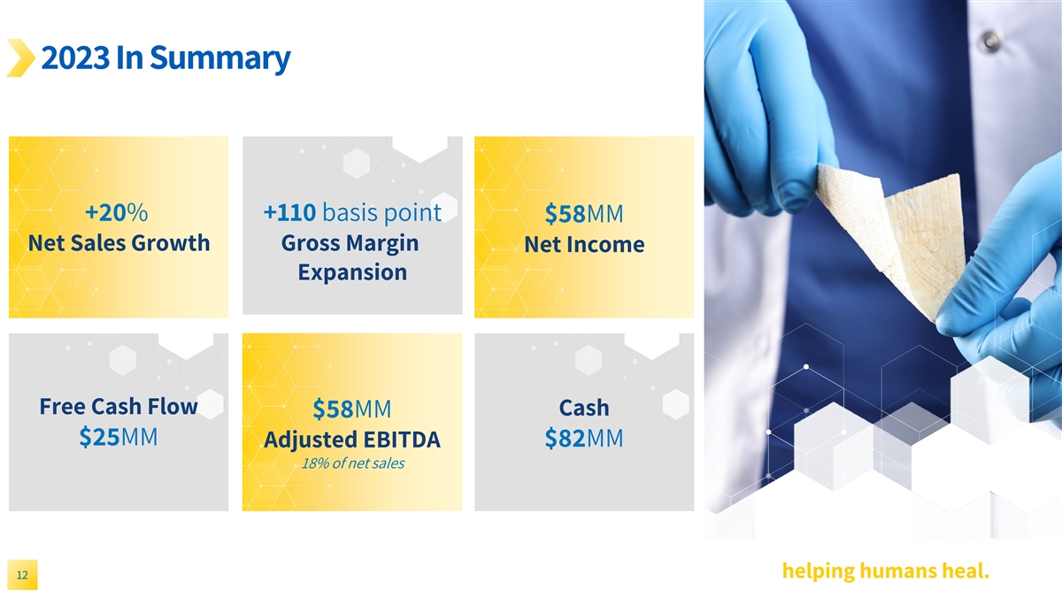2023 In Summary +20% +110 basis point $58MM Net Sales Growth Gross Margin Net Income Expansion Free Cash Flow Cash $58MM $25MM $82MM Adjusted EBITDA 18% of net sales helping humans heal. 12