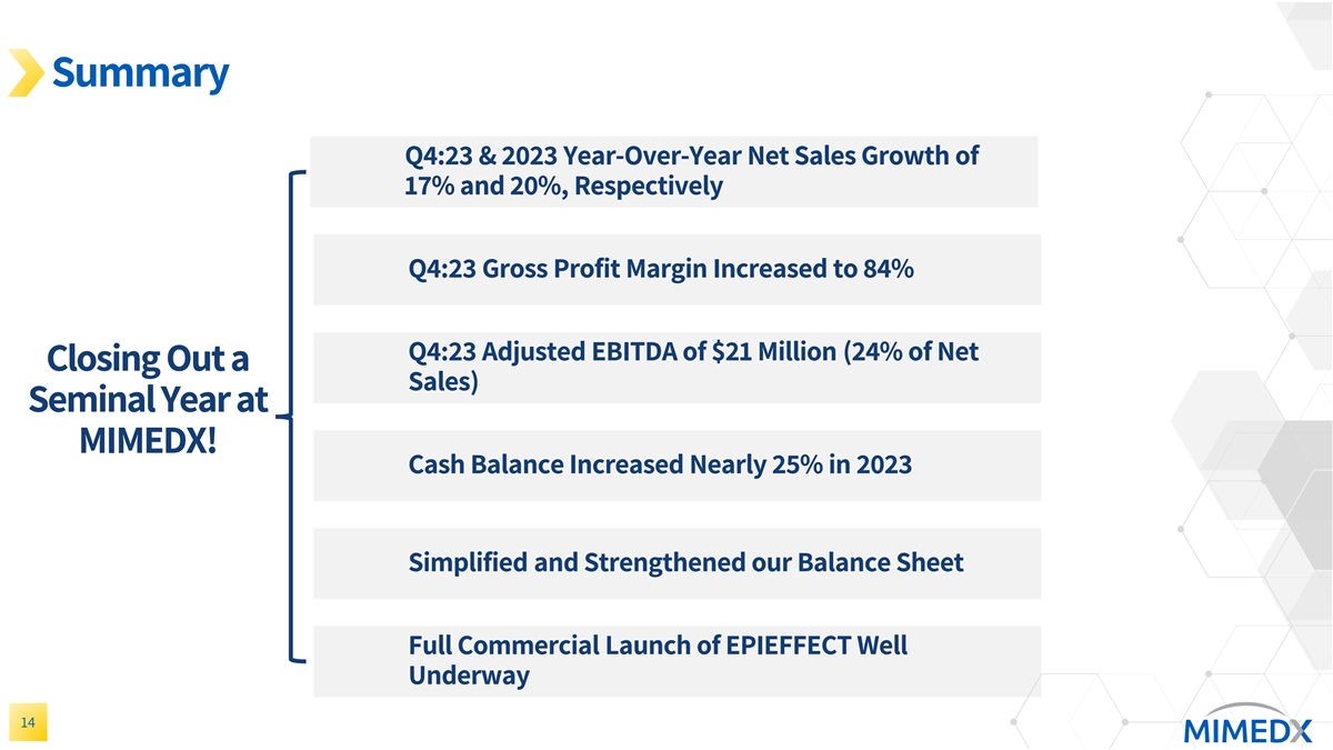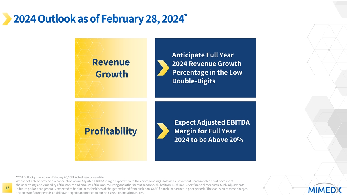 Summary Q4:23 & 2023 Year-Over-Year Net Sales Growth of 17% and 20%, Respectively Q4:23 Gross Profit Margin Increased to 84% Q4:23 Adjusted EBITDA of $21 Million (24% of Net Closing Out a Sales) Seminal Year at MIMEDX! Cash Balance Increased Nearly 25% in 2023 Simplified and Strengthened our Balance Sheet Full Commercial Launch of EPIEFFECT Well Underway 14