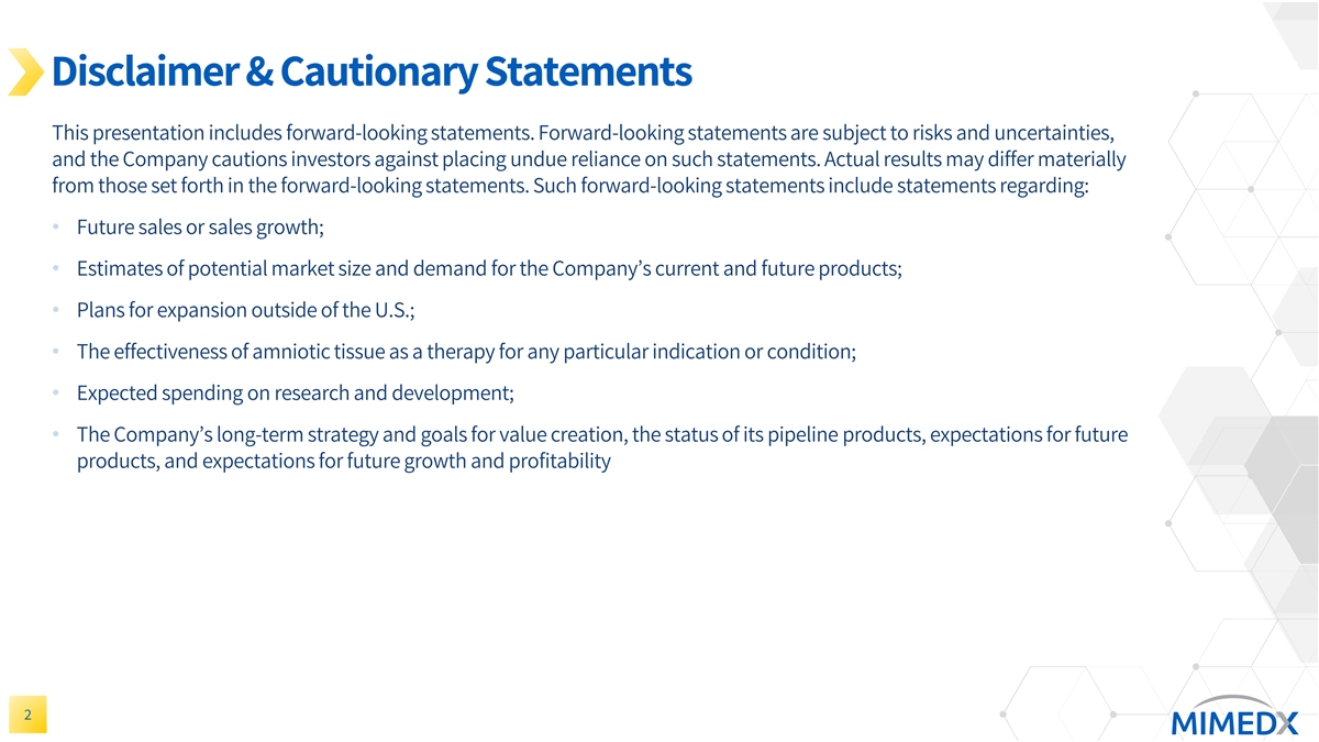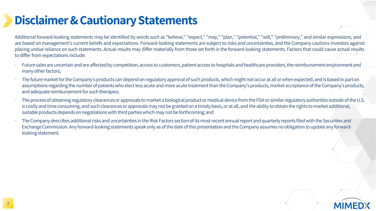 Disclaimer & Cautionary Statements This presentation includes forward-looking statements. Forward-looking statements are subject to risks and uncertainties, and the Company cautions investors against placing undue reliance on such statements. Actual results may differ materially from those set forth in the forward-looking statements. Such forward-looking statements include statements regarding: • Future sales or sales growth; • Estimates of potential market size and demand for the Company’s current and future products; • Plans for expansion outside of the U.S.; • The effectiveness of amniotic tissue as a therapy for any particular indication or condition; • Expected spending on research and development; • The Company’s long-term strategy and goals for value creation, the status of its pipeline products, expectations for future products, and expectations for future growth and profitability 2