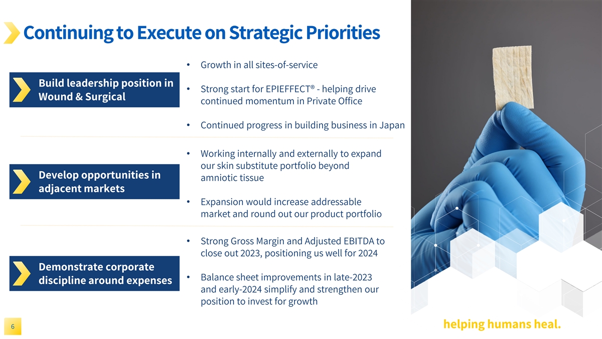 Continuing to Execute on Strategic Priorities • Growth in all sites-of-service Build leadership position in • Strong start for EPIEFFECT® - helping drive Wound & Surgical continued momentum in Private Office • Continued progress in building business in Japan • Working internally and externally to expand our skin substitute portfolio beyond Develop opportunities in amniotic tissue adjacent markets • Expansion would increase addressable market and round out our product portfolio • Strong Gross Margin and Adjusted EBITDA to close out 2023, positioning us well for 2024 Demonstrate corporate • Balance sheet improvements in late-2023 discipline around expenses and early-2024 simplify and strengthen our position to invest for growth helping humans heal. 6