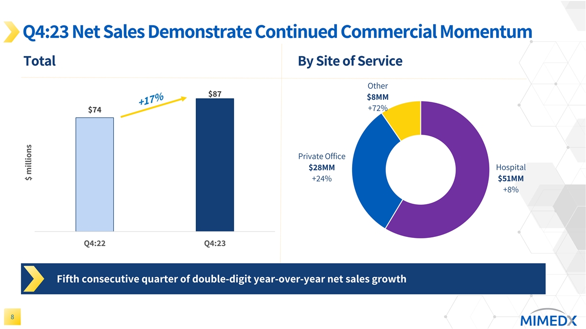 MIMEDX reported net sales for the three months ended December 31, 2023, of $87 million, compared to $74 million for the three months ended December 31, 2022, an increase of 17%. Net sales growth came from solid contributions in both the Wound & Surgical end markets and across each of our main sites of service.