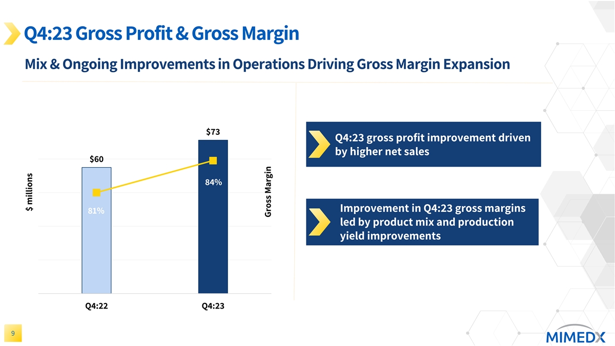Q4:23 Net Sales Demonstrate Continued Commercial Momentum Total By Site of Service Other $87 $8MM +72% $74 Private Office Hospital $28MM +24% $51MM +8% Q4:22 Q4:23 Fifth consecutive quarter of double-digit year-over-year net sales growth 8 $ millions