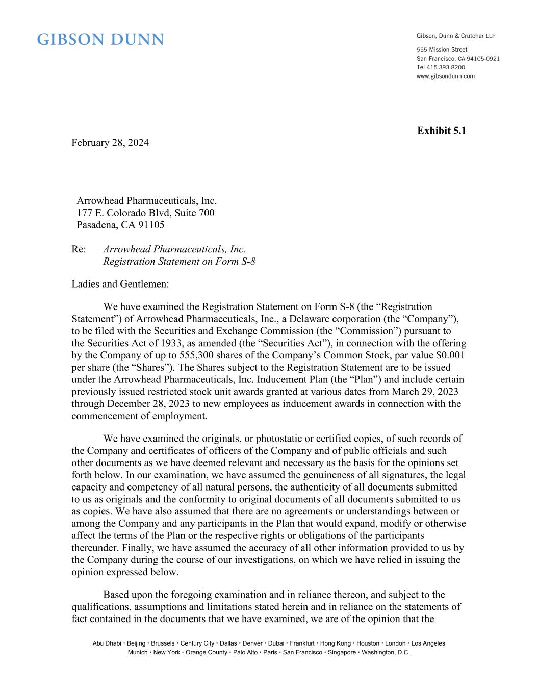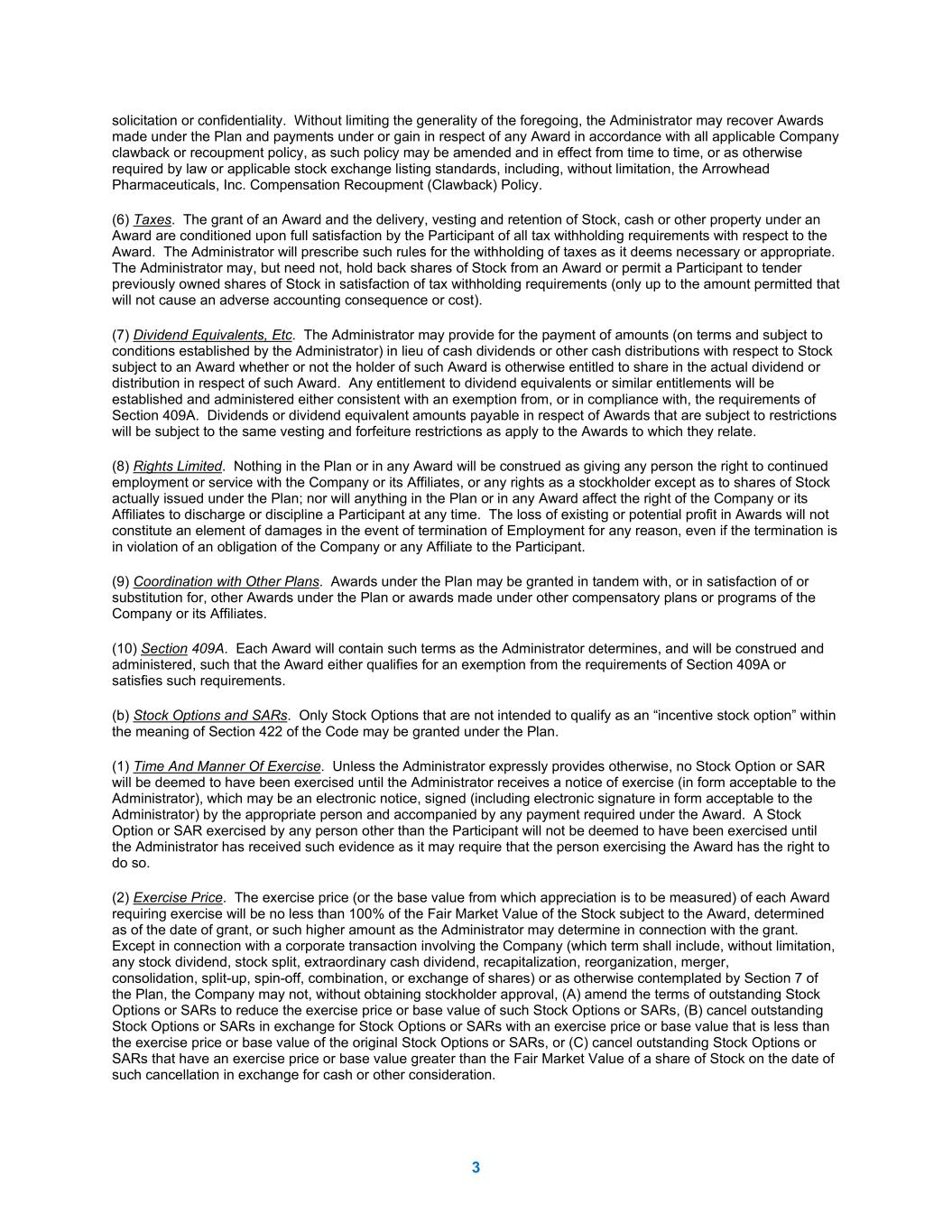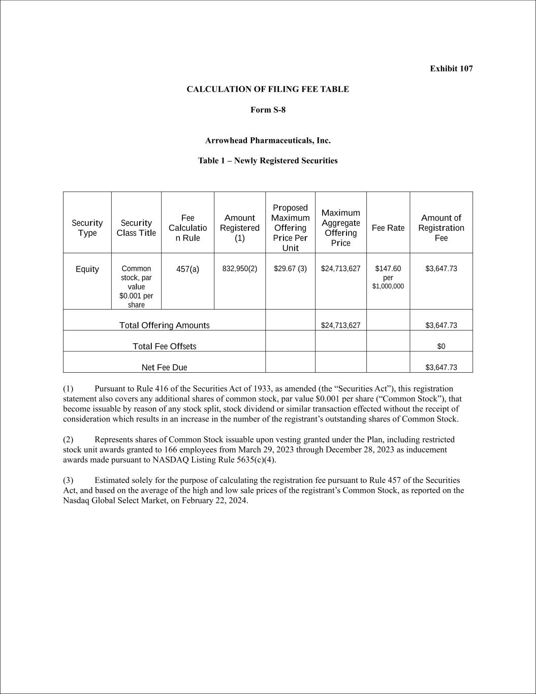 This registration statement on Form S-8 is being filed by Arrowhead Pharmaceuticals, Inc. (the “Registrant” or the “Company”) to register a total of 832,950 shares of Common Stock, par value $0.001 per share (“Common Stock”), issuable under the Arrowhead Pharmaceuticals, Inc. Inducement Plan (the “Plan”), including previously announced restricted stock units granted at various dates from March 29, 2023 to December 28, 2023 to new employees as inducement awards in connection with the commencement of employment pursuant to NASDAQ Listing Rule 5635(c)(4).