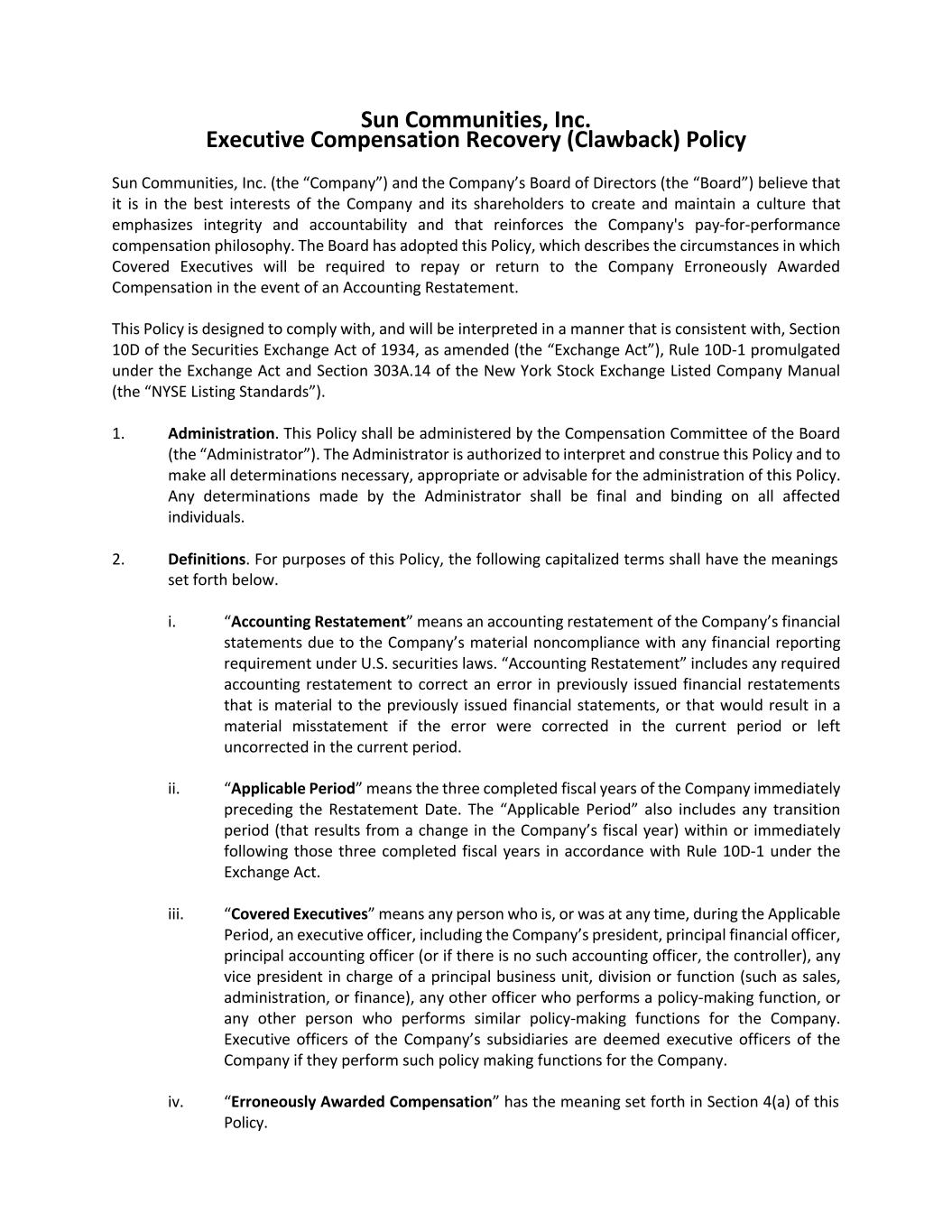 sui-20231231FALSE2023FY0000912593TRUEFALSEP1YP8YP3YP3Y1,000,000P5Yhttp://www.suncommunities.com/20231231#GainLossOnRemeasurementOfNoteReceivablehttp://www.suncommunities.com/20231231#GainLossOnRemeasurementOfNoteReceivablehttp://fasb.org/us-gaap/2023#RealEstateInvestmentPropertyNethttp://fasb.org/us-gaap/2023#RealEstateInvestmentPropertyNethttp://fasb.org/us-gaap/2023#OtherAssetshttp://fasb.org/us-gaap/2023#OtherAssetshttp://fasb.org/us-gaap/2023#OtherLiabilitieshttp://fasb.org/us-gaap/2023#OtherLiabilitieshttp://fasb.org/us-gaap/2023#OtherLiabilitieshttp://fasb.org/us-gaap/2023#OtherLiabilitieshttp://fasb.org/us-gaap/2023#OtherAssetImpairmentCharges00009125932023-01-012023-12-3100009125932023-06-30iso4217:USD00009125932024-02-20xbrli:shares00009125932023-12-3100009125932022-12-31iso4217:USDxbrli:shares00009125932022-01-012022-12-3100009125932021-01-012021-12-3100009125932020-12-310000912593us-gaap:CommonStockMember2020-12-310000912593us-gaap:AdditionalPaidInCapitalMember2020-12-310000912593us-gaap:RetainedEarningsMember2020-12-310000912593us-gaap:AociIncludingPortionAttributableToNoncontrollingInterestMember2020-12-310000912593us-gaap:NoncontrollingInterestMember2020-12-310000912593sui:TotalEquityMember2020-12-310000912593us-gaap:CommonStockMember2021-01-012021-12-310000912593us-gaap:AdditionalPaidInCapitalMember2021-01-012021-12-310000912593us-gaap:NoncontrollingInterestMember2021-01-012021-12-310000912593sui:TotalEquityMember2021-01-012021-12-310000912593us-gaap:RetainedEarningsMember2021-01-012021-12-310000912593sui:SeriesJPreferredOPUnitsMember2021-01-012021-12-310000912593sui:TotalEquityMembersui:SeriesJPreferredOPUnitsMember2021-01-012021-12-310000912593us-gaap:AociIncludingPortionAttributableToNoncontrollingInterestMember2021-01-012021-12-3100009125932021-12-310000912593us-gaap:CommonStockMember2021-12-310000912593us-gaap:AdditionalPaidInCapitalMember2021-12-310000912593us-gaap:RetainedEarningsMember2021-12-310000912593us-gaap:AociIncludingPortionAttributableToNoncontrollingInterestMember2021-12-310000912593us-gaap:NoncontrollingInterestMember2021-12-310000912593sui:TotalEquityMember2021-12-310000912593us-gaap:CommonStockMember2022-01-012022-12-310000912593us-gaap:AdditionalPaidInCapitalMember2022-01-012022-12-310000912593us-gaap:NoncontrollingInterestMember2022-01-012022-12-310000912593sui:TotalEquityMember2022-01-012022-12-310000912593us-gaap:RetainedEarningsMember2022-01-012022-12-310000912593us-gaap:AociIncludingPortionAttributableToNoncontrollingInterestMember2022-01-012022-12-310000912593us-gaap:CommonStockMember2022-12-310000912593us-gaap:AdditionalPaidInCapitalMember2022-12-310000912593us-gaap:RetainedEarningsMember2022-12-310000912593us-gaap:AociIncludingPortionAttributableToNoncontrollingInterestMember2022-12-310000912593us-gaap:NoncontrollingInterestMember2022-12-310000912593sui:TotalEquityMember2022-12-310000912593us-gaap:CommonStockMember2023-01-012023-12-310000912593us-gaap:AdditionalPaidInCapitalMember2023-01-012023-12-310000912593us-gaap:NoncontrollingInterestMember2023-01-012023-12-310000912593sui:TotalEquityMember2023-01-012023-12-310000912593us-gaap:RetainedEarningsMember2023-01-012023-12-310000912593sui:SeriesKPreferredOPUnitsMember2023-01-012023-12-310000912593sui:SeriesKPreferredOPUnitsMembersui:TotalEquityMember2023-01-012023-12-310000912593us-gaap:NoncontrollingInterestMembersui:SeriesLPreferredOPUnitsMember2023-01-012023-12-310000912593sui:SeriesLPreferredOPUnitsMember2023-01-012023-12-310000912593sui:TotalEquityMembersui:SeriesLPreferredOPUnitsMember2023-01-012023-12-310000912593us-gaap:AociIncludingPortionAttributableToNoncontrollingInterestMember2023-01-012023-12-310000912593us-gaap:CommonStockMember2023-12-310000912593us-gaap:AdditionalPaidInCapitalMember2023-12-310000912593us-gaap:RetainedEarningsMember2023-12-310000912593us-gaap:AociIncludingPortionAttributableToNoncontrollingInterestMember2023-12-310000912593us-gaap:NoncontrollingInterestMember2023-12-310000912593sui:TotalEquityMember2023-12-310000912593sui:CommonOpUnitsMembersui:RudgatePropertiesMember2023-01-012023-12-310000912593sui:CommonOpUnitsMembersui:RudgatePropertiesMember2022-01-012022-12-310000912593sui:CommonOpUnitsMembersui:RudgatePropertiesMember2021-01-012021-12-310000912593sui:SeriesJPreferredOPUnitsMember2023-01-012023-12-310000912593sui:SeriesJPreferredOPUnitsMember2022-01-012022-12-310000912593sui:SeriesKPreferredOPUnitsMember2022-01-012022-12-310000912593sui:SeriesKPreferredOPUnitsMember2021-01-012021-12-310000912593sui:MotorHomeCommunityRVResortAndMarinaMember2023-12-31sui:property0000912593sui:ManufacturedHomeCommunityMember2023-12-310000912593sui:RvCommunityMember2023-12-310000912593sui:MarinasMember2023-12-310000912593sui:AnnualRvSitesMember2023-12-310000912593sui:TransientRVsiteMember2023-12-310000912593sui:ManufacturedHomeAndRvCommunityMember2023-12-31sui:segment0000912593us-gaap:OtherAssetsMember2022-12-310000912593us-gaap:OtherAssetsMember2023-12-310000912593us-gaap:ComputerEquipmentMembersrt:MinimumMember2023-12-310000912593us-gaap:ComputerEquipmentMembersrt:MaximumMember2023-12-310000912593us-gaap:LoansPayableMember2023-12-310000912593us-gaap:LoansPayableMember2022-12-310000912593sui:SeniorUnsecuredNotesMember2023-12-310000912593sui:SeniorUnsecuredNotesMember2022-12-310000912593us-gaap:RevolvingCreditFacilityMember2023-12-310000912593us-gaap:RevolvingCreditFacilityMember2022-12-310000912593us-gaap:RevolvingCreditFacilityMemberus-gaap:OtherAssetsMember2023-12-310000912593us-gaap:RevolvingCreditFacilityMemberus-gaap:OtherAssetsMember2022-12-310000912593sui:ParkHolidaysCashDepositMember2023-12-31iso4217:GBP0000912593sui:ParkHolidaysCashDepositMember2022-12-31xbrli:pure0000912593srt:MinimumMember2023-01-012023-12-310000912593srt:MaximumMember2023-01-012023-12-310000912593sui:SafeHarborAndParkHolidaysMember2023-12-310000912593sui:SafeHarborMember2022-12-310000912593us-gaap:TrademarksAndTradeNamesMembersrt:MinimumMember2023-12-310000912593us-gaap:TrademarksAndTradeNamesMembe