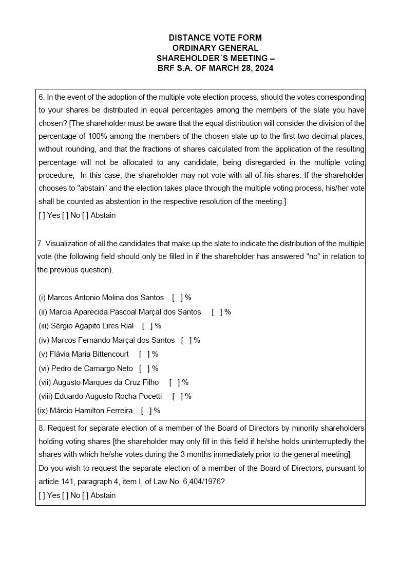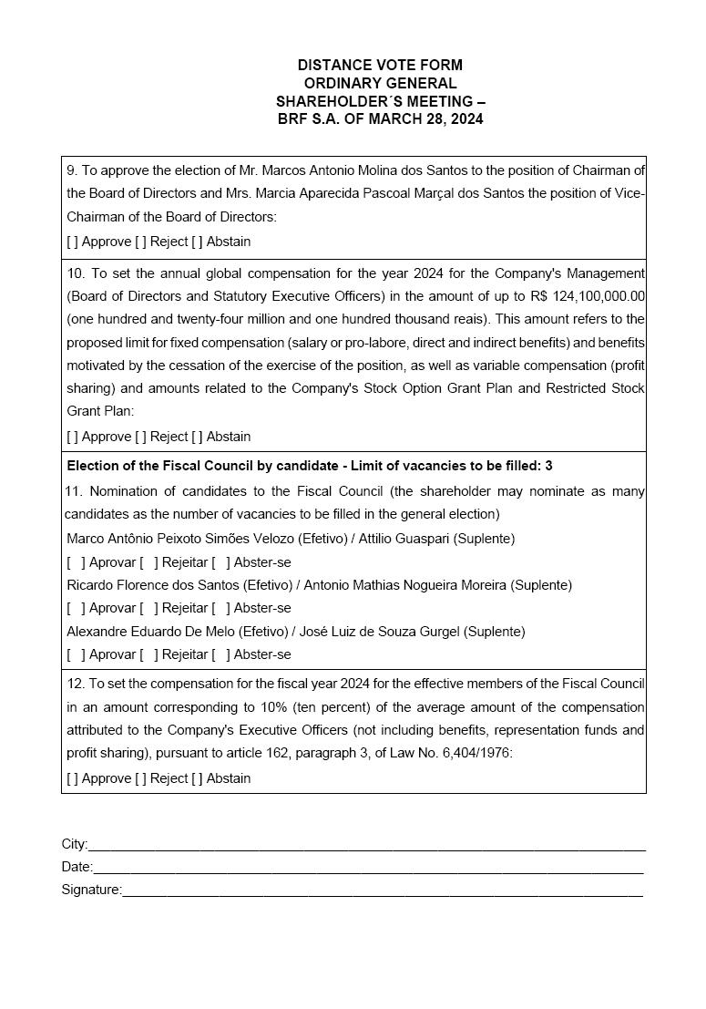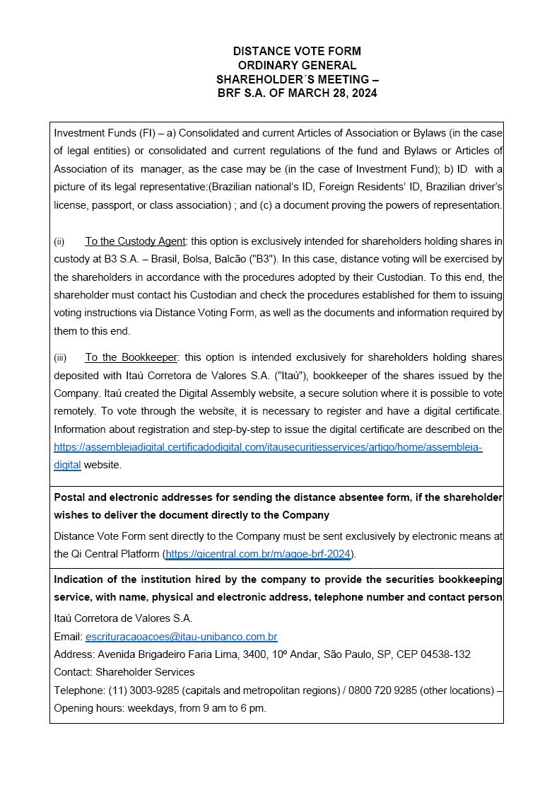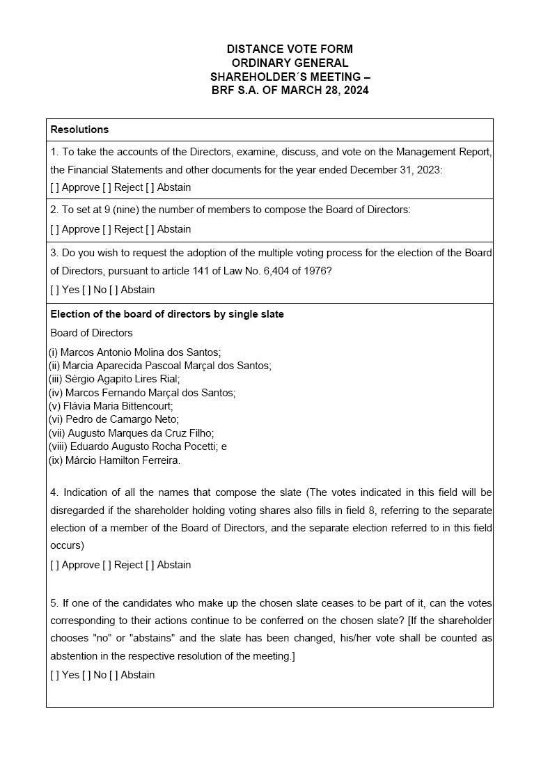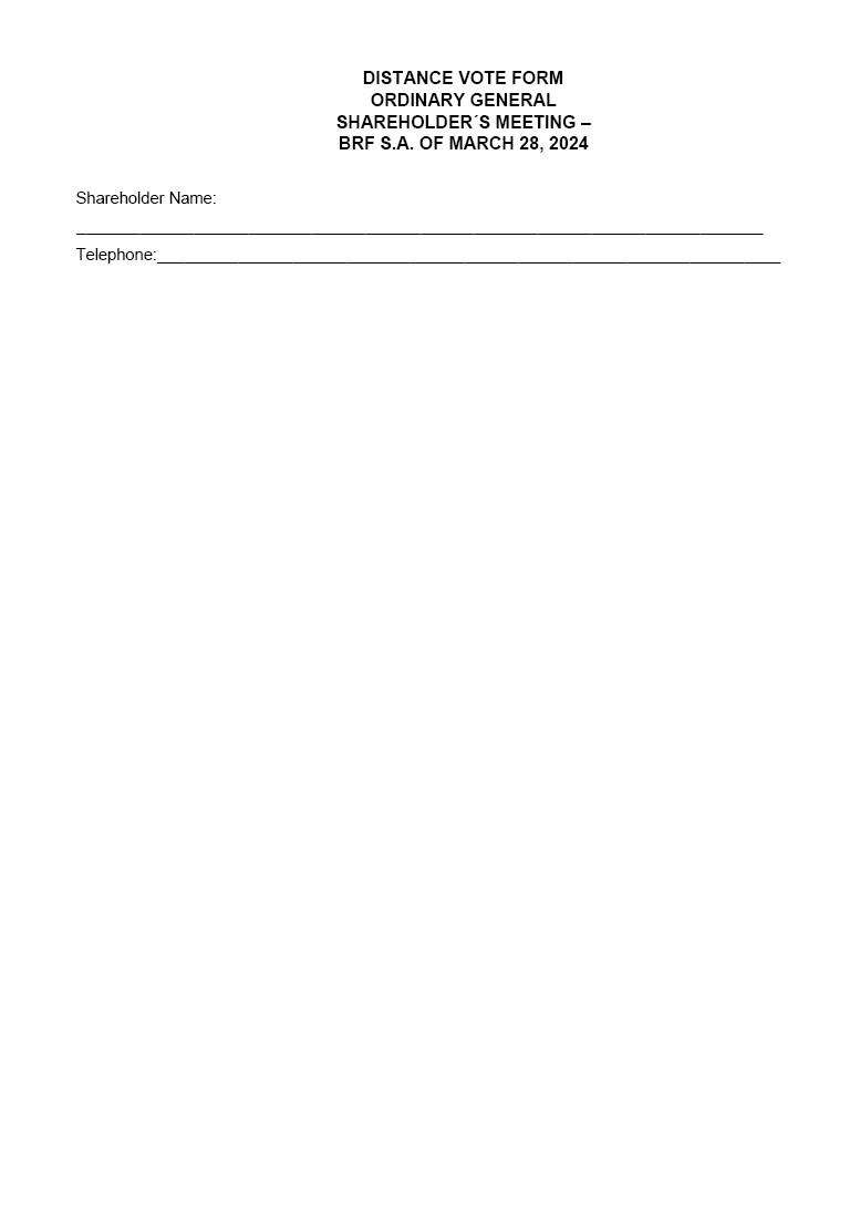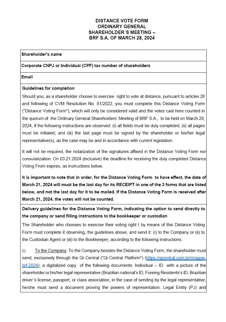 | 1 | DISTANCE VOTE FORM ORDINARY GENERAL SHAREHOLDER´S MEETING – BRF S.A. OF MARCH 28, 2024 |