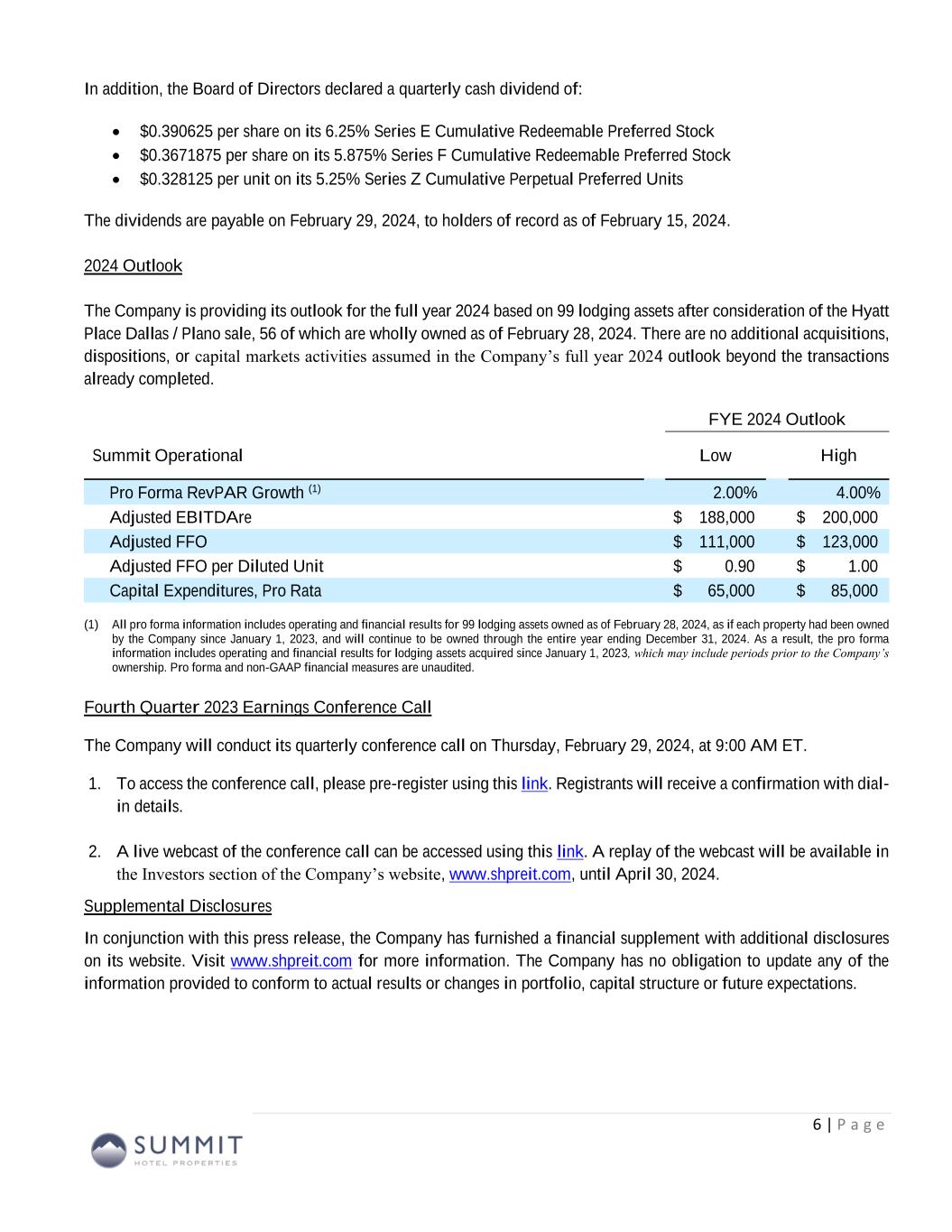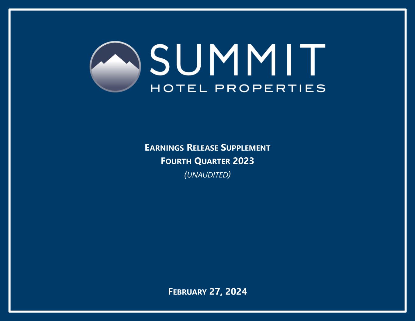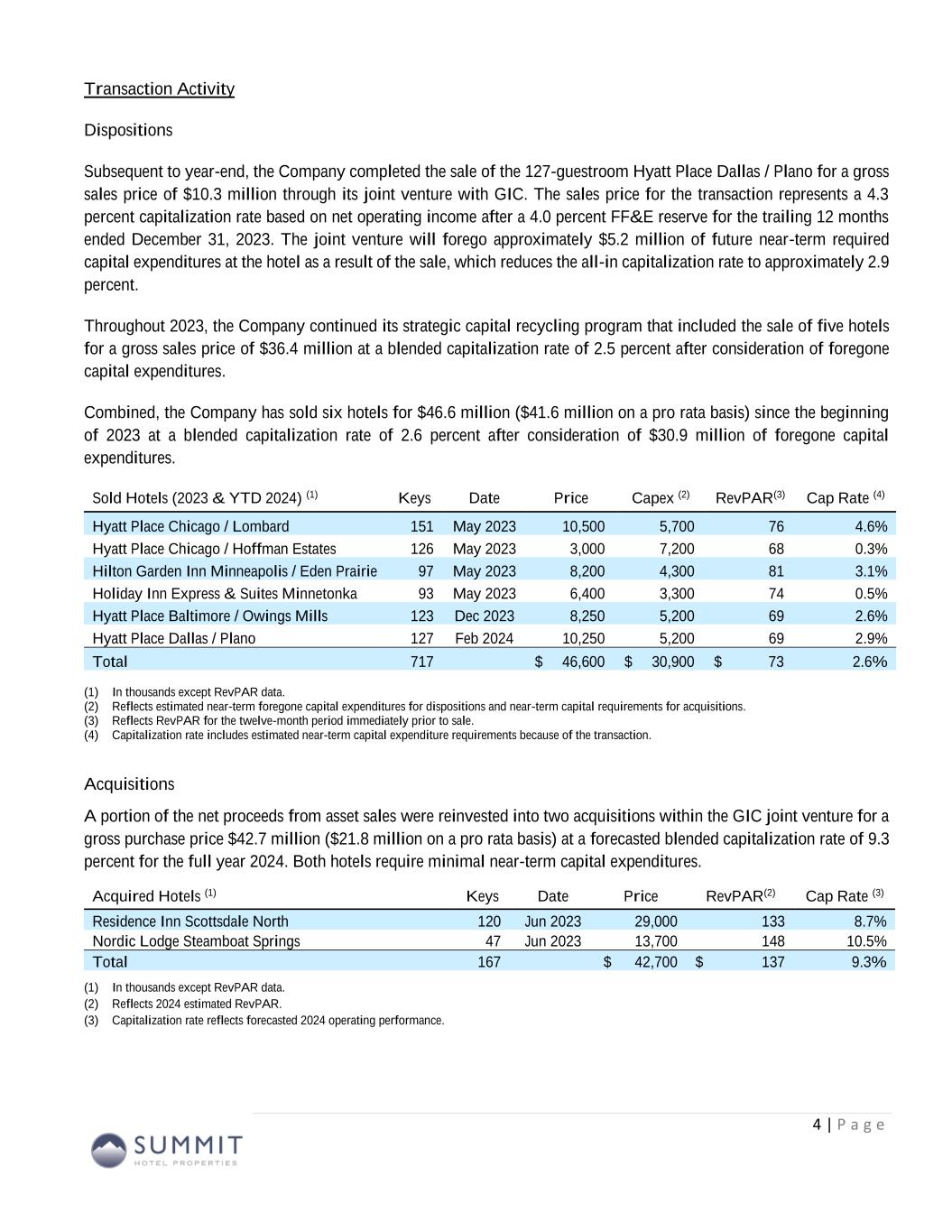 Forward-Looking Statements We make forward-looking statements in this presentation that are subject to risks and uncertainties. These forward-looking statements include information about possible or assumed future results of our business, financial condition, liquidity, results of operations, plans, and objectives. When we use the words “believe,” “expect,” “anticipate,” “estimate,” “plan,” “continue,” “intend,” “should,” “may,” or similar expressions, we intend to identify forward-looking statements. Statements regarding the following subjects, among others, may be forward-looking by their nature: • our ability to increase our dividend per share of common stock; • the state of the U.S. economy generally or in specific geographic regions in which we operate, and the effect of general economic conditions on the lodging industry and our business in particular; • market trends in our industry, interest rates, real estate values and the capital markets; • our business and investment strategy and, particularly, our ability to identify and complete hotel acquisitions and dispositions; • our projected operating results; • actions and initiatives of the U.S. government and changes to U.S. government policies and the execution and impact of such actions, initiatives and policies; • our ability to manage our relationships with our management companies and franchisors; • our ability to maintain our existing and future financing arrangements; • changes in the value of our properties; • the impact of and changes in governmental regulations, tax law and rates, accounting guidance and similar matters; • our ability to satisfy the requirements for qualification as a REIT under the U.S. Tax Code; • our ability to repay or refinance our indebtedness as it matures or becomes callable by lenders; • the availability of qualified personnel; • our ability to make distributions to our stockholders in the future; • the general volatility of the market price of our securities; and • the degree and nature of our competition. Forward-looking statements are based on our beliefs, assumptions and expectations of our future performance, taking into account information currently available to us. You should not place undue reliance on these forward-looking statements. These beliefs, assumptions and expectations can change as a result of many possible events or factors, not all of which are known to us. These factors are discussed under “Item 1A. Risk Factors” in our Annual Report on Form 10-K for the year ended December 31, 2023, and in other documents we have filed with the Securities and Exchange Commission. If a change occurs, our business, financial condition, liquidity and results of operations may vary materially from those expressed in our forward-looking statements. Any forward-looking statement is effective only as of the date on which it is made. New risks and uncertainties arise over time, and it is not possible for us to predict those events or how they may affect us. Except as required by law we are not obligated to, and do not intend to, publicly update or revise any forward-looking statements, whether as a result of new information, future events or otherwise. Additionally, this presentation contains certain unaudited historical and pro forma information and metrics which are based or calculated from historical data that is maintained or produced by Summit Hotel Properties, Inc. or third parties. This presentation contain statistics and other data that may have been obtained from, or compiled from, information made available by third-parties. 3