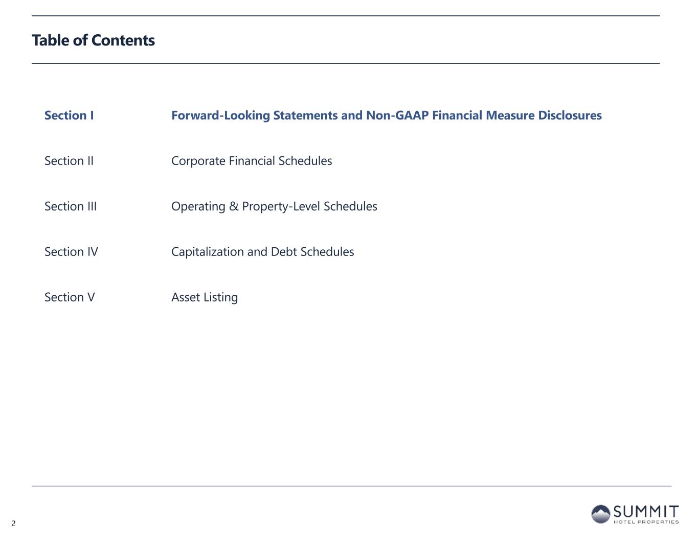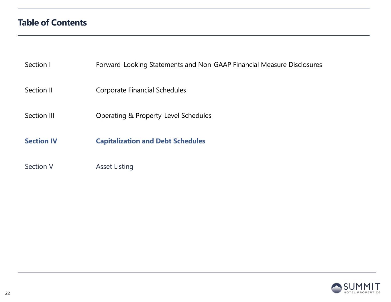 Table of Contents Section I Forward-Looking Statements and Non-GAAP Financial Measure Disclosures Section II Corporate Financial Schedules Section III Operating & Property-Level Schedules Section IV Capitalization and Debt Schedules Section V Asset Listing 22