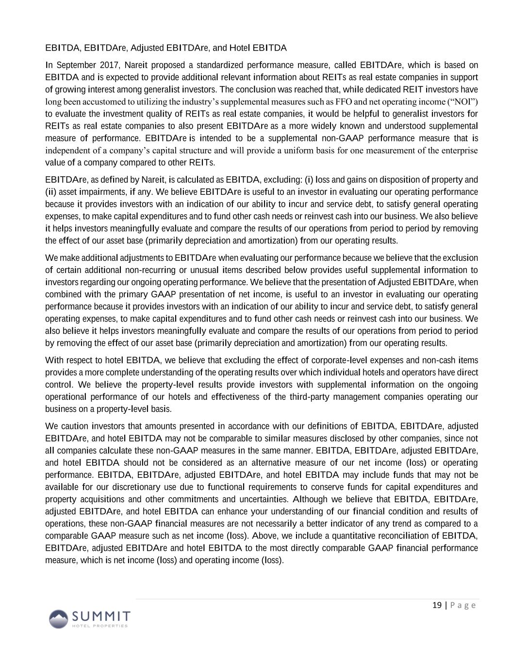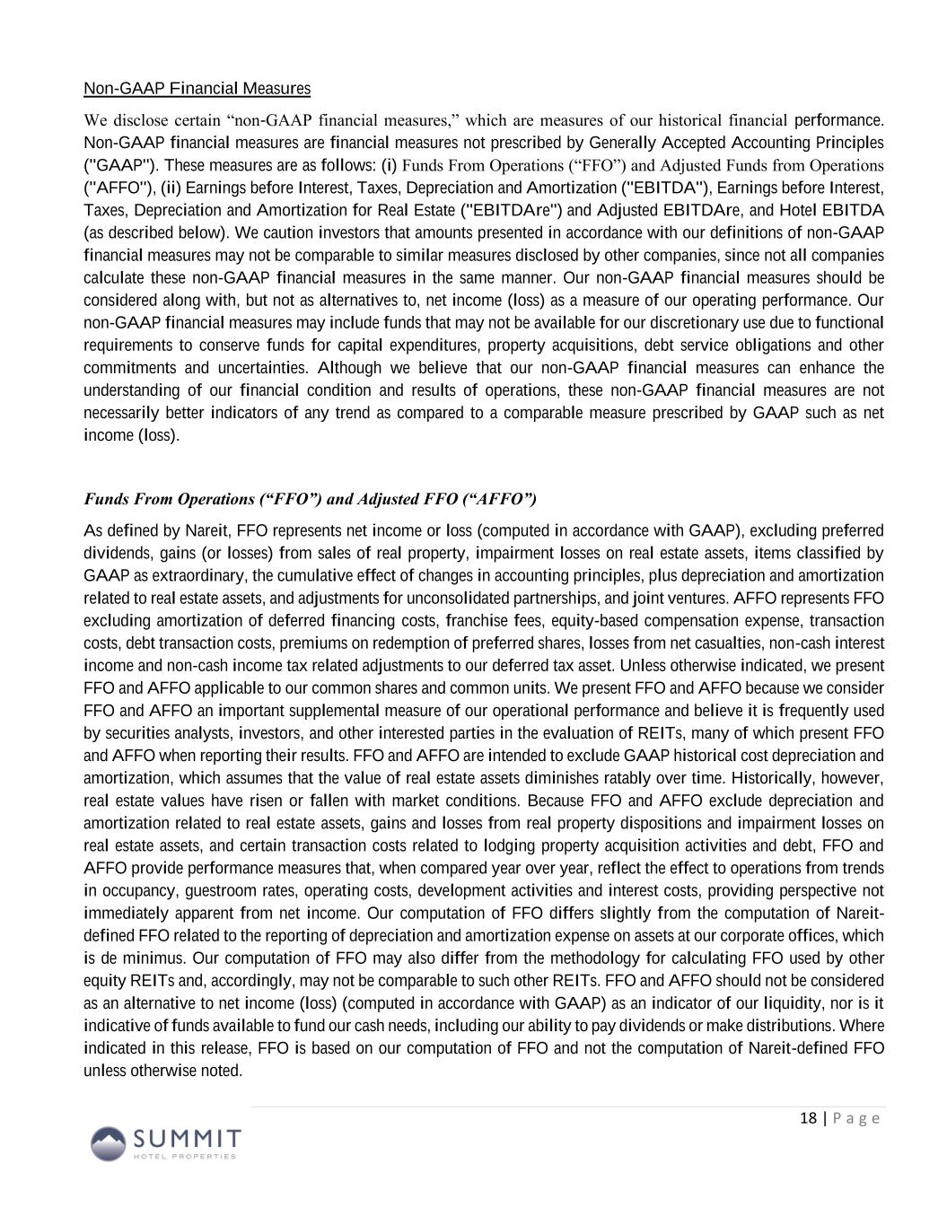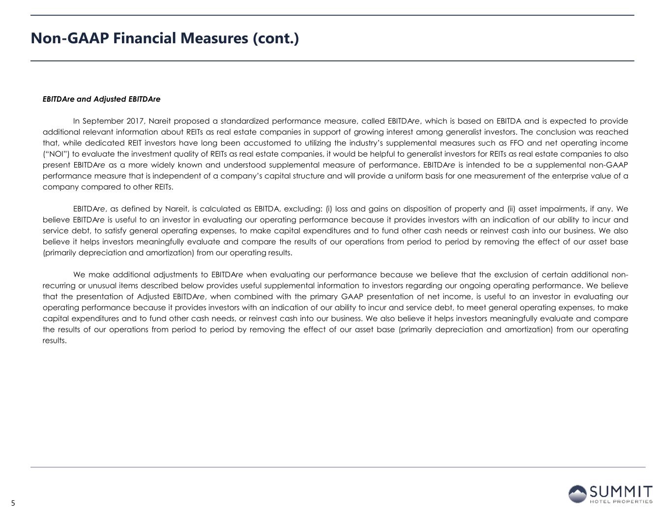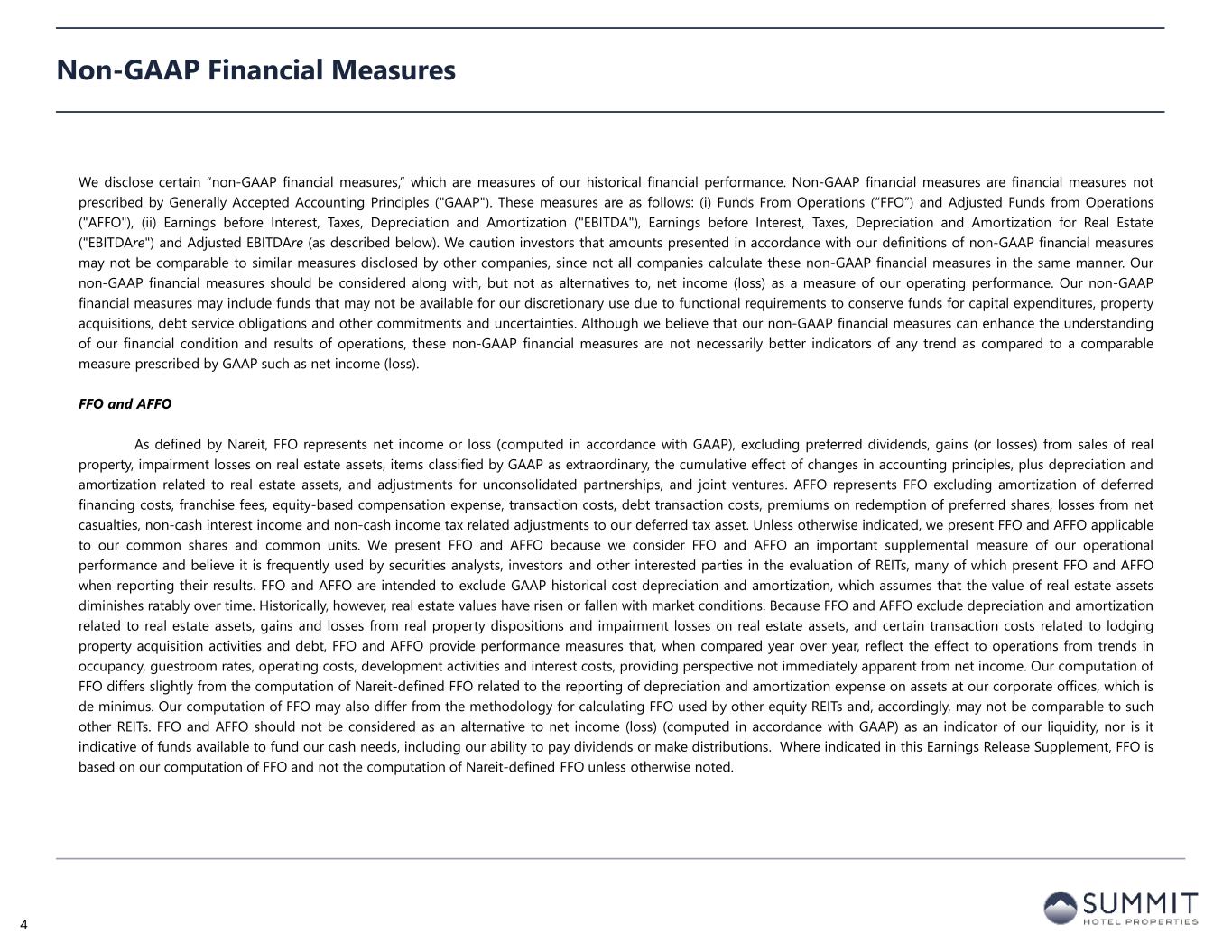 Non-GAAP Financial Measures We disclose certain “non-GAAP financial measures,” which are measures of our historical financial performance. Non-GAAP financial measures are financial measures not prescribed by Generally Accepted Accounting Principles ("GAAP"). These measures are as follows: (i) Funds From Operations (“FFO”) and Adjusted Funds from Operations ("AFFO"), (ii) Earnings before Interest, Taxes, Depreciation and Amortization ("EBITDA"), Earnings before Interest, Taxes, Depreciation and Amortization for Real Estate ("EBITDAre") and Adjusted EBITDAre (as described below). We caution investors that amounts presented in accordance with our definitions of non-GAAP financial measures may not be comparable to similar measures disclosed by other companies, since not all companies calculate these non-GAAP financial measures in the same manner. Our non-GAAP financial measures should be considered along with, but not as alternatives to, net income (loss) as a measure of our operating performance. Our non-GAAP financial measures may include funds that may not be available for our discretionary use due to functional requirements to conserve funds for capital expenditures, property acquisitions, debt service obligations and other commitments and uncertainties. Although we believe that our non-GAAP financial measures can enhance the understanding of our financial condition and results of operations, these non-GAAP financial measures are not necessarily better indicators of any trend as compared to a comparable measure prescribed by GAAP such as net income (loss). FFO and AFFO As defined by Nareit, FFO represents net income or loss (computed in accordance with GAAP), excluding preferred dividends, gains (or losses) from sales of real property, impairment losses on real estate assets, items classified by GAAP as extraordinary, the cumulative effect of changes in accounting principles, plus depreciation and amortization related to real estate assets, and adjustments for unconsolidated partnerships, and joint ventures. AFFO represents FFO excluding amortization of deferred financing costs, franchise fees, equity-based compensation expense, transaction costs, debt transaction costs, premiums on redemption of preferred shares, losses from net casualties, non-cash interest income and non-cash income tax related adjustments to our deferred tax asset. Unless otherwise indicated, we present FFO and AFFO applicable to our common shares and common units. We present FFO and AFFO because we consider FFO and AFFO an important supplemental measure of our operational performance and believe it is frequently used by securities analysts, investors and other interested parties in the evaluation of REITs, many of which present FFO and AFFO when reporting their results. FFO and AFFO are intended to exclude GAAP historical cost depreciation and amortization, which assumes that the value of real estate assets diminishes ratably over time. Historically, however, real estate values have risen or fallen with market conditions. Because FFO and AFFO exclude depreciation and amortization related to real estate assets, gains and losses from real property dispositions and impairment losses on real estate assets, and certain transaction costs related to lodging property acquisition activities and debt, FFO and AFFO provide performance measures that, when compared year over year, reflect the effect to operations from trends in occupancy, guestroom rates, operating costs, development activities and interest costs, providing perspective not immediately apparent from net income. Our computation of FFO differs slightly from the computation of Nareit-defined FFO related to the reporting of depreciation and amortization expense on assets at our corporate offices, which is de minimus. Our computation of FFO may also differ from the methodology for calculating FFO used by other equity REITs and, accordingly, may not be comparable to such other REITs. FFO and AFFO should not be considered as an alternative to net income (loss) (computed in accordance with GAAP) as an indicator of our liquidity, nor is it indicative of funds available to fund our cash needs, including our ability to pay dividends or make distributions. Where indicated in this Earnings Release Supplement, FFO is based on our computation of FFO and not the computation of Nareit-defined FFO unless otherwise noted. 4
