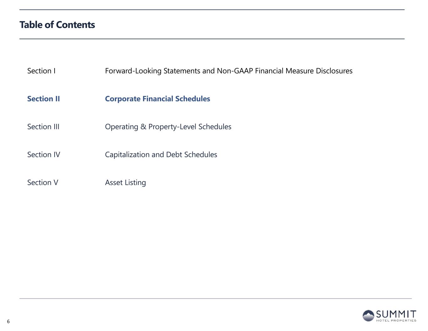 Table of Contents Section I Forward-Looking Statements and Non-GAAP Financial Measure Disclosures Section II Corporate Financial Schedules Section III Operating & Property-Level Schedules Section IV Capitalization and Debt Schedules Section V Asset Listing 6