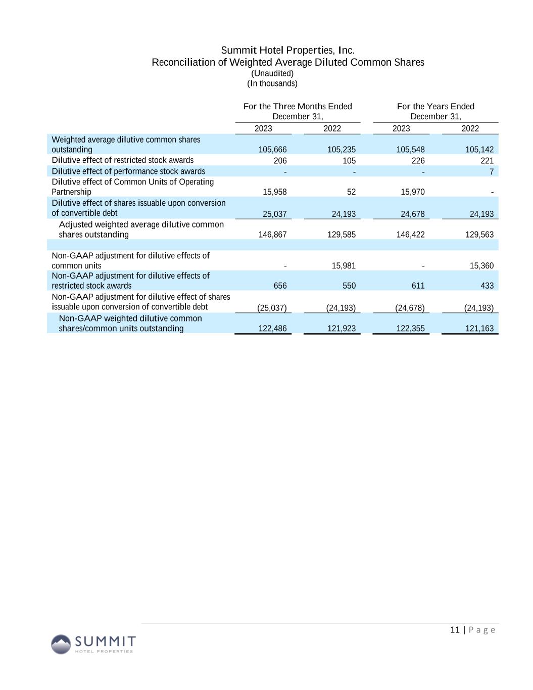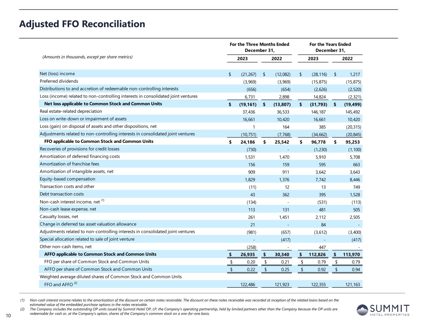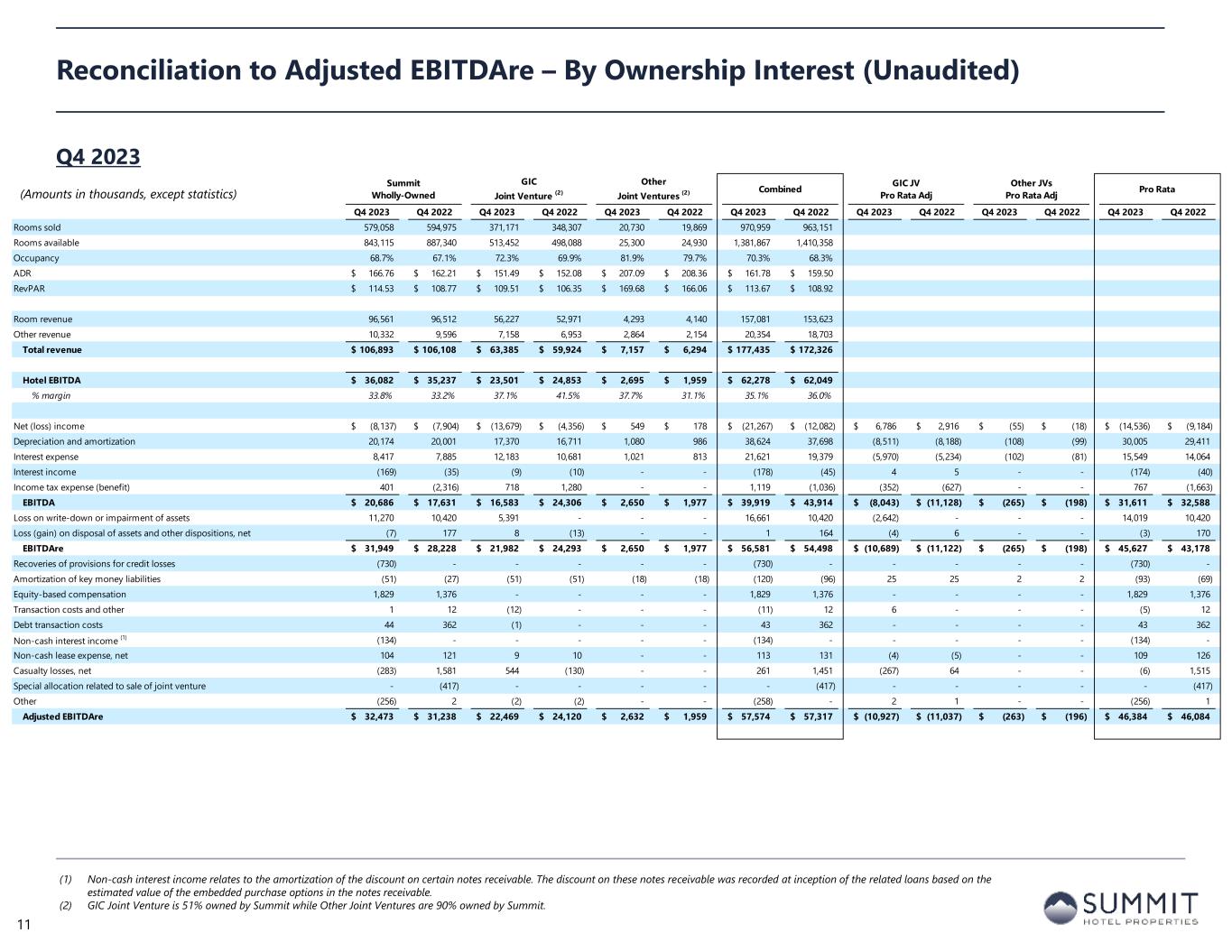 For the Three Months Ended December 31, For the Years Ended December 31, 2023 2022 2023 2022 Net (loss) income (21,267)$ (12,082)$ (28,116)$ 1,217$ Preferred dividends (3,969) (3,969) (15,875) (15,875) Distributions to and accretion of redeemable non-controlling interests (656) (654) (2,626) (2,520) Loss (income) related to non-controlling interests in consolidated joint ventures 6,731 2,898 14,824 (2,321) Net loss applicable to Common Stock and Common Units (19,161)$ (13,807)$ (31,793)$ (19,499)$ Real estate-related depreciation 37,436 36,533 146,187 145,492 Loss on write-down or impairment of assets 16,661 10,420 16,661 10,420 Loss (gain) on disposal of assets and other dispositions, net 1 164 385 (20,315) Adjustments related to non-controlling interests in consolidated joint ventures (10,751) (7,768) (34,662) (20,845) FFO applicable to Common Stock and Common Units 24,186$ 25,542$ 96,778$ 95,253$ Recoveries of provisions for credit losses (730) - (1,230) (1,100) Amortization of deferred financing costs 1,531 1,470 5,910 5,708 Amortization of franchise fees 156 159 595 663 Amortization of intangible assets, net 909 911 3,642 3,643 Equity-based compensation 1,829 1,376 7,742 8,446 Transaction costs and other (11) 12 13 749 Debt transaction costs 43 362 395 1,528 Non-cash interest income, net (1) (134) - (531) (113) Non-cash lease expense, net 113 131 481 505 Casualty losses, net 261 1,451 2,112 2,505 Change in deferred tax asset valuation allowance 21 - 84 - Adjustments related to non-controlling interests in consolidated joint ventures (981) (657) (3,612) (3,400) Special allocation related to sale of joint venture - (417) - (417) Other non-cash items, net (258) - 447 - AFFO applicable to Common Stock and Common Units 26,935$ 30,340$ 112,826$ 113,970$ FFO per share of Common Stock and Common Units 0.20$ 0.21$ 0.79$ 0.79$ AFFO per share of Common Stock and Common Units 0.22$ 0.25$ 0.92$ 0.94$ Weighted average diluted shares of Common Stock and Common Units FFO and AFFO (2) 122,486 121,923 122,355 121,163 Adjusted FFO Reconciliation (1) Non-cash interest income relates to the amortization of the discount on certain notes receivable. The discount on these notes receivable was recorded at inception of the related loans based on the estimated value of the embedded purchase options in the notes receivable. (2) The Company includes the outstanding OP units issued by Summit Hotel OP, LP, the Company’s operating partnership, held by limited partners other than the Company because the OP units are redeemable for cash or, at the Company’s option, shares of the Company’s common stock on a one-for-one basis. 10 (Amounts in thousands, except per share metrics)
