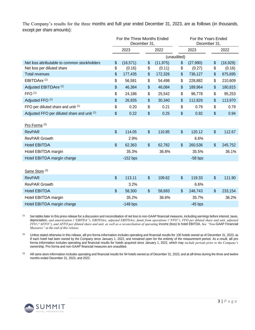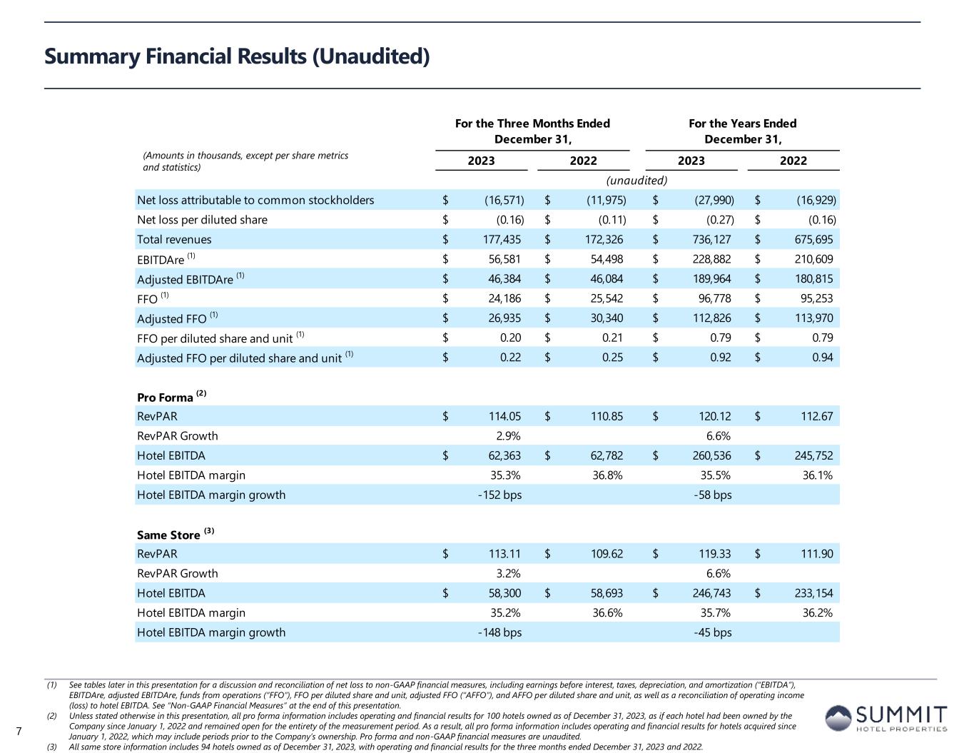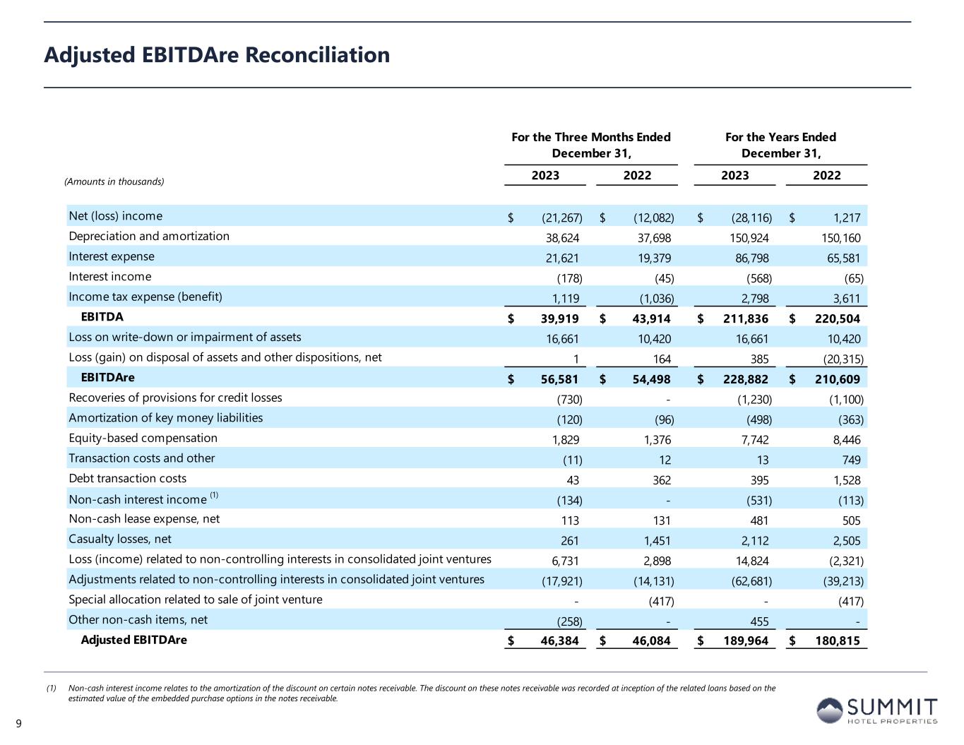 For the Three Months Ended December 31, For the Years Ended December 31, 2023 2022 2023 2022 Net (loss) income (21,267)$ (12,082)$ (28,116)$ 1,217$ Preferred dividends (3,969) (3,969) (15,875) (15,875) Distributions to and accretion of redeemable non-controlling interests (656) (654) (2,626) (2,520) Loss (income) related to non-controlling interests in consolidated joint ventures 6,731 2,898 14,824 (2,321) Net loss applicable to Common Stock and Common Units (19,161)$ (13,807)$ (31,793)$ (19,499)$ Real estate-related depreciation 37,436 36,533 146,187 145,492 Loss on write-down or impairment of assets 16,661 10,420 16,661 10,420 Loss (gain) on disposal of assets and other dispositions, net 1 164 385 (20,315) Adjustments related to non-controlling interests in consolidated joint ventures (10,751) (7,768) (34,662) (20,845) FFO applicable to Common Stock and Common Units 24,186$ 25,542$ 96,778$ 95,253$ Recoveries of provisions for credit losses (730) - (1,230) (1,100) Amortization of deferred financing costs 1,531 1,470 5,910 5,708 Amortization of franchise fees 156 159 595 663 Amortization of intangible assets, net 909 911 3,642 3,643 Equity-based compensation 1,829 1,376 7,742 8,446 Transaction costs and other (11) 12 13 749 Debt transaction costs 43 362 395 1,528 Non-cash interest income, net (1) (134) - (531) (113) Non-cash lease expense, net 113 131 481 505 Casualty losses, net 261 1,451 2,112 2,505 Change in deferred tax asset valuation allowance 21 - 84 - Adjustments related to non-controlling interests in consolidated joint ventures (981) (657) (3,612) (3,400) Special allocation related to sale of joint venture - (417) - (417) Other non-cash items, net (258) - 447 - AFFO applicable to Common Stock and Common Units 26,935$ 30,340$ 112,826$ 113,970$ FFO per share of Common Stock and Common Units 0.20$ 0.21$ 0.79$ 0.79$ AFFO per share of Common Stock and Common Units 0.22$ 0.25$ 0.92$ 0.94$ Weighted average diluted shares of Common Stock and Common Units FFO and AFFO (2) 122,486 121,923 122,355 121,163 Adjusted FFO Reconciliation (1) Non-cash interest income relates to the amortization of the discount on certain notes receivable. The discount on these notes receivable was recorded at inception of the related loans based on the estimated value of the embedded purchase options in the notes receivable. (2) The Company includes the outstanding OP units issued by Summit Hotel OP, LP, the Company’s operating partnership, held by limited partners other than the Company because the OP units are redeemable for cash or, at the Company’s option, shares of the Company’s common stock on a one-for-one basis. 10 (Amounts in thousands, except per share metrics)