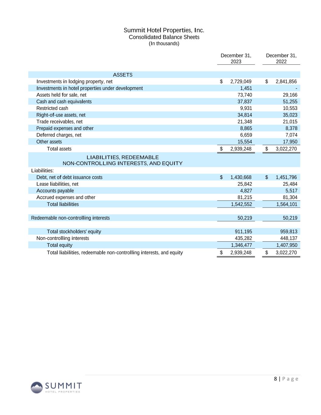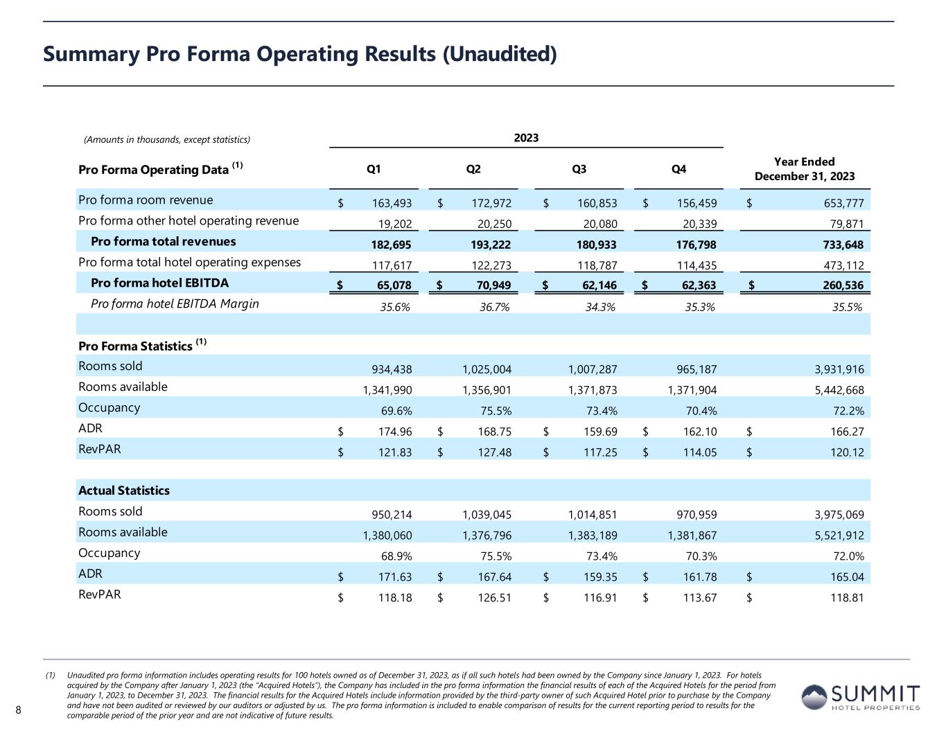 For the Three Months Ended December 31, For the Years Ended December 31, 2023 2022 2023 2022 (unaudited) Net loss attributable to common stockholders (16,571)$ (11,975)$ (27,990)$ (16,929)$ Net loss per diluted share (0.16)$ (0.11)$ (0.27)$ (0.16)$ Total revenues 177,435$ 172,326$ 736,127$ 675,695$ EBITDAre (1) 56,581$ 54,498$ 228,882$ 210,609$ Adjusted EBITDAre (1) 46,384$ 46,084$ 189,964$ 180,815$ FFO (1) 24,186$ 25,542$ 96,778$ 95,253$ Adjusted FFO (1) 26,935$ 30,340$ 112,826$ 113,970$ FFO per diluted share and unit (1) 0.20$ 0.21$ 0.79$ 0.79$ Adjusted FFO per diluted share and unit (1) 0.22$ 0.25$ 0.92$ 0.94$ Pro Forma (2) RevPAR 114.05$ 110.85$ 120.12$ 112.67$ RevPAR Growth 2.9% 6.6% Hotel EBITDA 62,363$ 62,782$ 260,536$ 245,752$ Hotel EBITDA margin 35.3% 36.8% 35.5% 36.1% Hotel EBITDA margin growth -152 bps -58 bps Same Store (3) RevPAR 113.11$ 109.62$ 119.33$ 111.90$ RevPAR Growth 3.2% 6.6% Hotel EBITDA 58,300$ 58,693$ 246,743$ 233,154$ Hotel EBITDA margin 35.2% 36.6% 35.7% 36.2% Hotel EBITDA margin growth -148 bps -45 bps Summary Financial Results (Unaudited) (1) See tables later in this presentation for a discussion and reconciliation of net loss to non-GAAP financial measures, including earnings before interest, taxes, depreciation, and amortization (“EBITDA”), EBITDAre, adjusted EBITDAre, funds from operations (“FFO”), FFO per diluted share and unit, adjusted FFO (“AFFO”), and AFFO per diluted share and unit, as well as a reconciliation of operating income (loss) to hotel EBITDA. See “Non-GAAP Financial Measures” at the end of this presentation. (2) Unless stated otherwise in this presentation, all pro forma information includes operating and financial results for 100 hotels owned as of December 31, 2023, as if each hotel had been owned by the Company since January 1, 2022 and remained open for the entirety of the measurement period. As a result, all pro forma information includes operating and financial results for hotels acquired since January 1, 2022, which may include periods prior to the Company’s ownership. Pro forma and non-GAAP financial measures are unaudited. (3) All same store information includes 94 hotels owned as of December 31, 2023, with operating and financial results for the three months ended December 31, 2023 and 2022. (Amounts in thousands, except per share metrics and statistics) 7