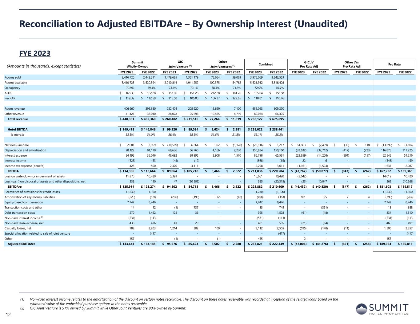 Summit Wholly-Owned GIC Joint Venture (2) Other Joint Ventures (2) Combined GIC JV Pro Rata Adj Other JVs Pro Rata Adj Pro Rata SEC Filing - 10Q/K Q4 2023 Q4 2022 Q4 2023 Q4 2022 Q4 2023 Q4 2022 Q4 2023 Q4 2022 Q4 2023 Q4 2022 Q4 2023 Q4 2022 Q4 2023 Q4 2022 Rooms sold 579,058 594,975 371,171 348,307 20,730 19,869 970,959 963,151 Rooms available 843,115 887,340 513,452 498,088 25,300 24,930 1,381,867 1,410,358 Occupancy 68.7% 67.1% 72.3% 69.9% 81.9% 79.7% 70.3% 68.3% ADR 166.76$ 162.21$ 151.49$ 152.08$ 207.09$ 208.36$ 161.78$ 159.50$ RevPAR 114.53$ 108.77$ 109.51$ 106.35$ 169.68$ 166.06$ 113.67$ 108.92$ Room revenue 96,561 96,512 56,227 52,971 4,293 4,140 157,081 153,623 Other revenue 10,332 9,596 7,158 6,953 2,864 2,154 20,354 18,703 Total revenue 106,893$ 106,108$ 63,385$ 59,924$ 7,157$ 6,294$ 177,435$ 172,326$ Hotel EBITDA 36,082$ 35,237$ 23,501$ 24,853$ 2,695$ 1,959$ 62,278$ 62,049$ % margin 33.8% 33.2% 37.1% 41.5% 37.7% 31.1% 35.1% 36.0% Net (loss) income (8,137)$ (7,904)$ (13,679)$ (4,356)$ 549$ 178$ (21,267)$ (12,082)$ 6,786$ 2,916$ (55)$ (18)$ (14,536)$ (9,184)$ Depreciation and amortization 20,174 20,001 17,370 16,711 1,080 986 38,624 37,698 (8,511) (8,188) (108) (99) 30,005 29,411 Interest expense 8,417 7,885 12,183 10,681 1,021 813 21,621 19,379 (5,970) (5,234) (102) (81) 15,549 14,064 Interest income (169) (35) (9) (10) - - (178) (45) 4 5 - - (174) (40) Income tax expense (benefit) 401 (2,316) 718 1,280 - - 1,119 (1,036) (352) (627) - - 767 (1,663) EBITDA 20,686$ 17,631$ 16,583$ 24,306$ 2,650$ 1,977$ 39,919$ 43,914$ (8,043)$ (11,128)$ (265)$ (198)$ 31,611$ 32,588$ Loss on write-down or impairment of assets 11,270 10,420 5,391 - - - 16,661 10,420 (2,642) - - - 14,019 10,420 Loss (gain) on disposal of assets and other dispositions, net (7) 177 8 (13) - - 1 164 (4) 6 - - (3) 170 EBITDAre 31,949$ 28,228$ 21,982$ 24,293$ 2,650$ 1,977$ 56,581$ 54,498$ (10,689)$ (11,122)$ (265)$ (198)$ 45,627$ 43,178$ Recoveries of provisions for credit losses (730) - - - - - (730) - - - - - (730) - Amortization of key money liabilities (51) (27) (51) (51) (18) (18) (120) (96) 25 25 2 2 (93) (69) Equity-based compensation 1,829 1,376 - - - - 1,829 1,376 - - - - 1,829 1,376 Transaction costs and other 1 12 (12) - - - (11) 12 6 - - - (5) 12 Debt transaction costs 44 362 (1) - - - 43 362 - - - - 43 362 Non-cash interest income (1) (134) - - - - - (134) - - - - - (134) - Non-cash lease expense, net 104 121 9 10 - - 113 131 (4) (5) - - 109 126 Casualty losses, net (283) 1,581 544 (130) - - 261 1,451 (267) 64 - - (6) 1,515 Special allocation related to sale of joint venture - (417) - - - - - (417) - - - - - (417) Other (256) 2 (2) (2) - - (258) - 2 1 - - (256) 1 Adjusted EBITDAre 32,473$ 31,238$ 22,469$ 24,120$ 2,632$ 1,959$ 57,574$ 57,317$ (10,927)$ (11,037)$ (263)$ (196)$ 46,384$ 46,084$ Reconciliation to Adjusted EBITDAre – By Ownership Interest (Unaudited) Q4 2023 (1) Non-cash interest income relates to the amortization of the discount on certain notes receivable. The discount on these notes receivable was recorded at inception of the related loans based on the estimated value of the embedded purchase options in the notes receivable. (2) GIC Joint Venture is 51% owned by Summit while Other Joint Ventures are 90% owned by Summit. 11 (Amounts in thousands, except statistics)