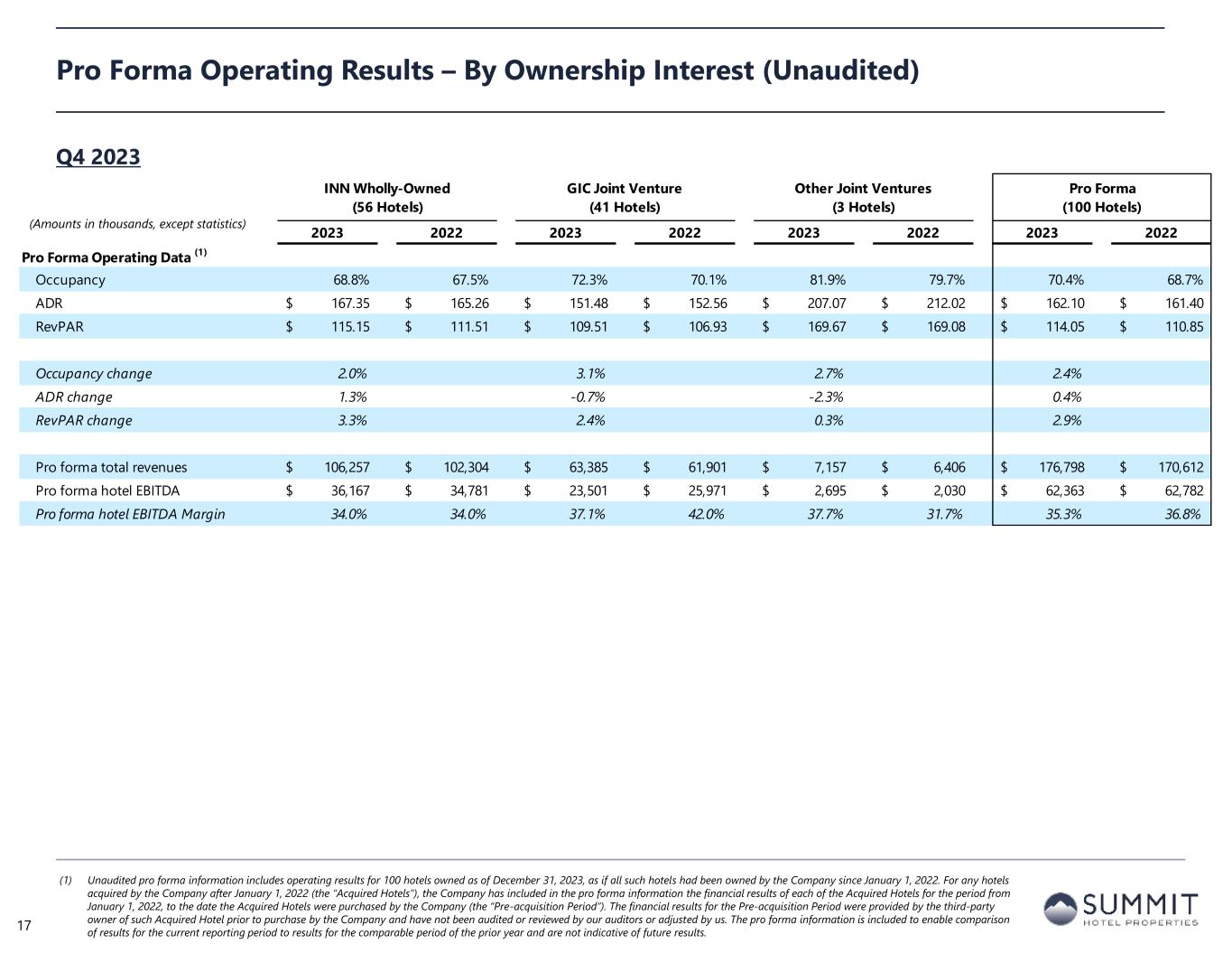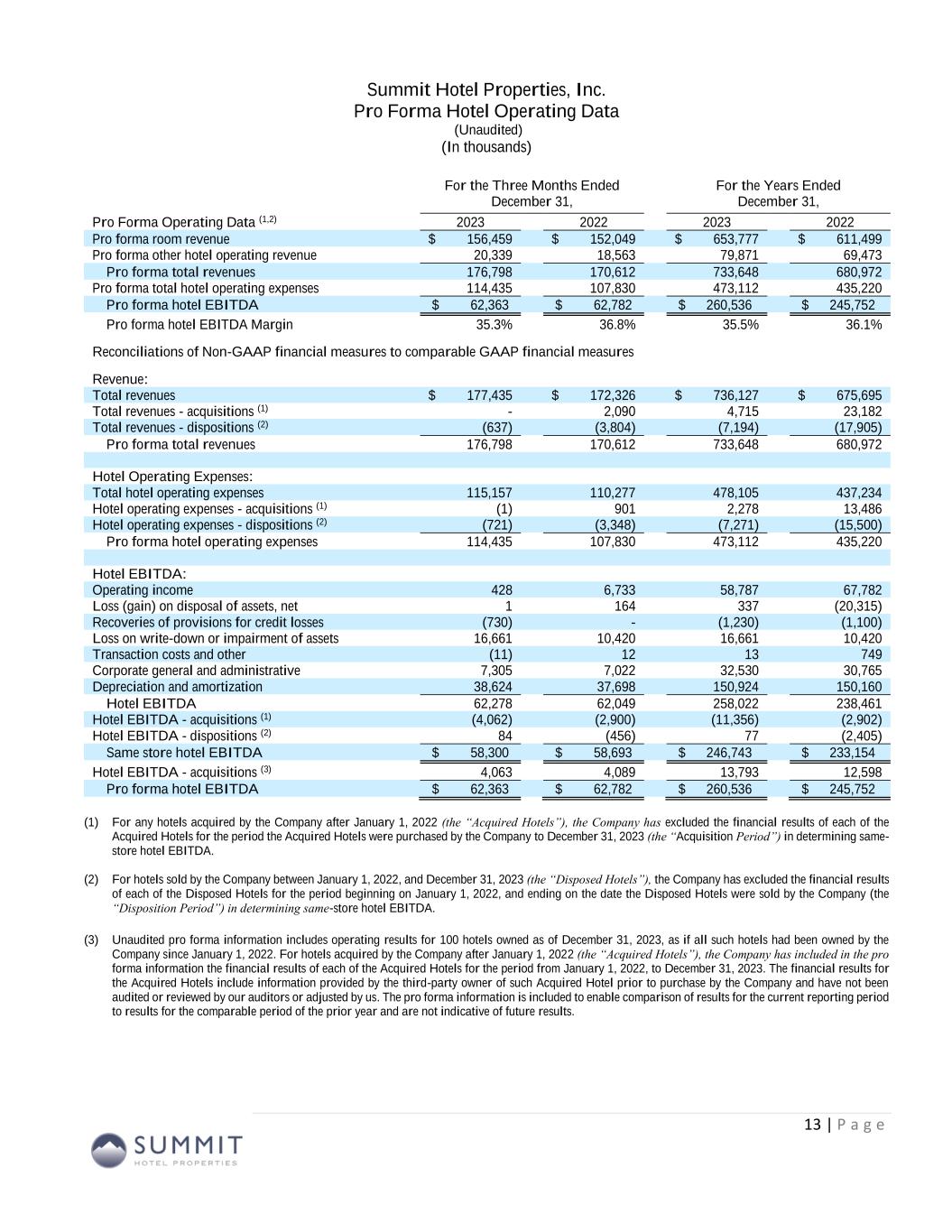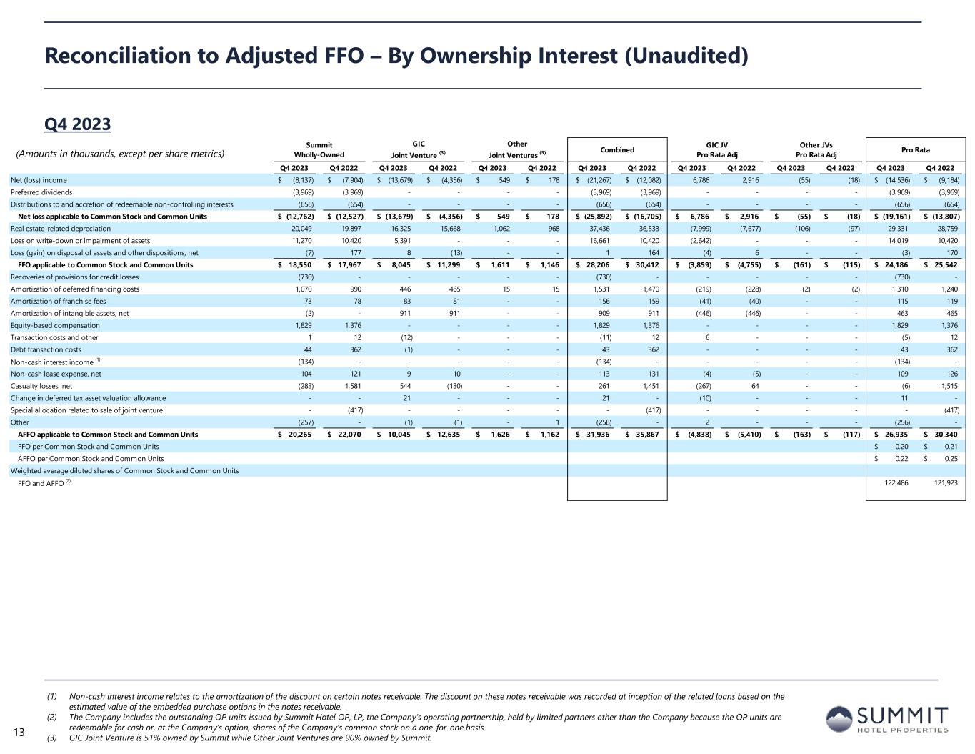 Summit Wholly-Owned GIC Joint Venture (2) Other Joint Ventures (2) Combined GIC JV Pro Rata Adj Other JVs Pro Rata Adj Pro Rata SEC Filing - 10Q/K FYE 2023 FYE 2022 FYE 2023 FYE 2022 FYE 2023 FYE 2022 FYE 2023 FYE 2022 FYE 2023 FYE 2022 FYE 2023 FYE 2022 FYE 2023 FYE 2022 Rooms sold 2,416,720 2,442,311 1,479,685 1,361,179 78,664 39,063 3,975,069 3,842,553 Rooms available 3,410,723 3,520,394 2,010,814 1,941,252 100,375 54,762 5,521,912 5,516,408 Occupancy 70.9% 69.4% 73.6% 70.1% 78.4% 71.3% 72.0% 69.7% ADR 168.39$ 162.28$ 157.06$ 151.28$ 212.28$ 181.76$ 165.04$ 158.58$ RevPAR 119.32$ 112.59$ 115.58$ 106.08$ 166.37$ 129.65$ 118.81$ 110.46$ Room revenue 406,960 396,350 232,404 205,920 16,699 7,100 656,063 609,370 Other revenue 41,421 36,010 28,078 25,596 10,565 4,719 80,064 66,325 Total revenue 448,381$ 432,360$ 260,482$ 231,516$ 27,264$ 11,819$ 736,127$ 675,695$ Hotel EBITDA 149,478$ 146,846$ 99,920$ 89,034$ 8,624$ 2,581$ 258,022$ 238,461$ % margin 33.3% 34.0% 38.4% 38.5% 31.6% 21.8% 35.1% 35.3% Net (loss) income 2,081$ (3,969)$ (30,589)$ 6,364$ 392$ (1,178)$ (28,116)$ 1,217$ 14,863$ (2,439)$ (39)$ 118$ (13,292)$ (1,104)$ Depreciation and amortization 78,122 81,170 68,636 66,760 4,166 2,230 150,924 150,160 (33,632) (32,712) (417) (223) 116,875 117,225 Interest expense 34,198 35,016 48,692 28,995 3,908 1,570 86,798 65,581 (23,859) (14,208) (391) (157) 62,548 51,216 Interest income (523) (53) (45) (12) - - (568) (65) 22 6 - - (546) (59) Income tax expense (benefit) 428 500 2,370 3,111 - - 2,798 3,611 (1,161) (1,524) - - 1,637 2,087 EBITDA 114,306$ 112,664$ 89,064$ 105,218$ 8,466$ 2,622$ 211,836$ 220,504$ (43,767)$ (50,877)$ (847)$ (262)$ 167,222$ 169,365$ Loss on write-down or impairment of assets 11,270 10,420 5,391 - - - 16,661 10,420 (2,642) - - - 14,019 10,420 Loss (gain) on disposal of assets and other dispositions, net 338 190 47 (20,505) - - 385 (20,315) (23) 10,047 - - 362 (10,268) EBITDAre 125,914$ 123,274$ 94,502$ 84,713$ 8,466$ 2,622$ 228,882$ 210,609$ (46,432)$ (40,830)$ (847)$ (262)$ 181,603$ 169,517$ Recoveries of provisions for credit losses (1,230) (1,100) - - - - (1,230) (1,100) - - - - (1,230) (1,100) Amortization of key money liabilities (220) (128) (206) (193) (72) (42) (498) (363) 101 95 7 4 (390) (264) Equity-based compensation 7,742 8,446 - - - - 7,742 8,446 - - - - 7,742 8,446 Transaction costs and other 14 12 (1) 737 - - 13 749 - (361) - - 13 388 Debt transaction costs 270 1,492 125 36 - - 395 1,528 (61) (18) - - 334 1,510 Non-cash interest income (1) (531) (113) - - - - (531) (113) - - - - (531) (113) Non-cash lease expense, net 438 476 43 29 - - 481 505 (21) (14) - - 460 491 Casualty losses, net 789 2,203 1,214 302 109 - 2,112 2,505 (595) (148) (11) - 1,506 2,357 Special allocation related to sale of joint venture - (417) - - - - - (417) - - - - - (417) Other 457 - (1) - (1) - 455 - 2 - - - 457 - Adjusted EBITDAre 133,643$ 134,145$ 95,676$ 85,624$ 8,502$ 2,580$ 237,821$ 222,349$ (47,006)$ (41,276)$ (851)$ (258)$ 189,964$ 180,815$ Reconciliation to Adjusted EBITDAre – By Ownership Interest (Unaudited) FYE 2023 (1) Non-cash interest income relates to the amortization of the discount on certain notes receivable. The discount on these notes receivable was recorded at inception of the related loans based on the estimated value of the embedded purchase options in the notes receivable. (2) GIC Joint Venture is 51% owned by Summit while Other Joint Ventures are 90% owned by Summit. 12 (Amounts in thousands, except statistics)