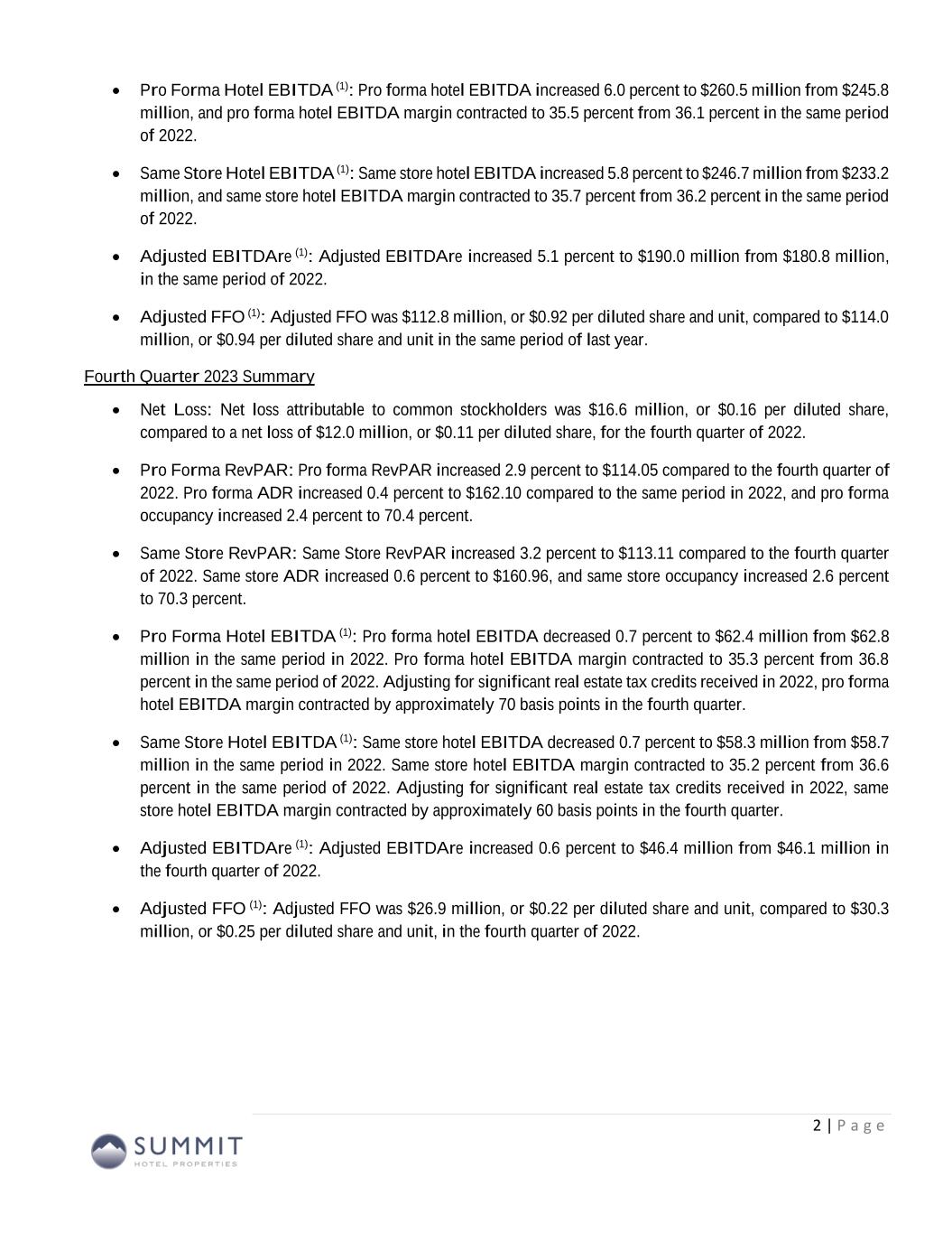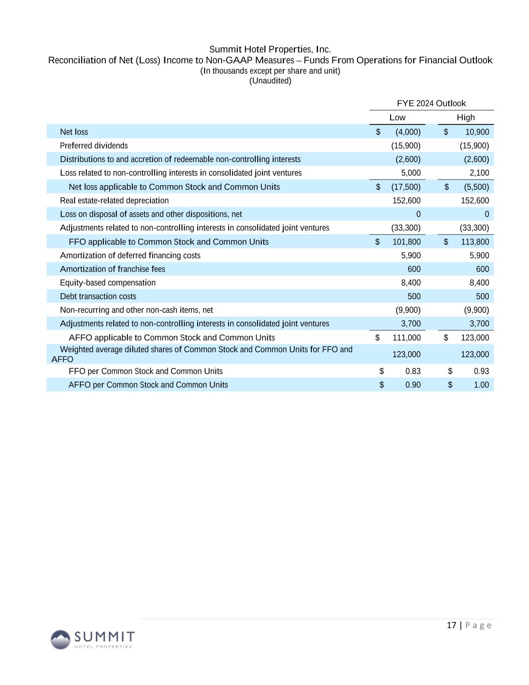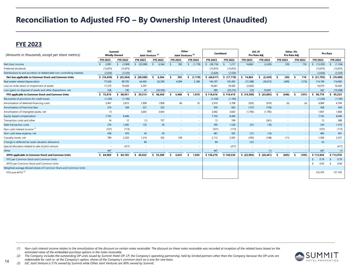 Summit Wholly-Owned GIC Joint Venture (3) Other Joint Ventures (3) Combined GIC JV Pro Rata Adj Other JVs Pro Rata Adj Pro Rata Q4 2023 Q4 2022 Q4 2023 Q4 2022 Q4 2023 Q4 2022 Q4 2023 Q4 2022 Q4 2023 Q4 2022 Q4 2023 Q4 2022 Q4 2023 Q4 2022 Net (loss) income (8,137)$ (7,904)$ (13,679)$ (4,356)$ 549$ 178$ (21,267)$ (12,082)$ 6,786 2,916 (55) (18) (14,536)$ (9,184)$ Preferred dividends (3,969) (3,969) - - - - (3,969) (3,969) - - - - (3,969) (3,969) Distributions to and accretion of redeemable non-controlling interests (656) (654) - - - - (656) (654) - - - - (656) (654) Net loss applicable to Common Stock and Common Units (12,762)$ (12,527)$ (13,679)$ (4,356)$ 549$ 178$ (25,892)$ (16,705)$ 6,786$ 2,916$ (55)$ (18)$ (19,161)$ (13,807)$ Real estate-related depreciation 20,049 19,897 16,325 15,668 1,062 968 37,436 36,533 (7,999) (7,677) (106) (97) 29,331 28,759 Loss on write-down or impairment of assets 11,270 10,420 5,391 - - - 16,661 10,420 (2,642) - - - 14,019 10,420 Loss (gain) on disposal of assets and other dispositions, net (7) 177 8 (13) - - 1 164 (4) 6 - - (3) 170 FFO applicable to Common Stock and Common Units 18,550$ 17,967$ 8,045$ 11,299$ 1,611$ 1,146$ 28,206$ 30,412$ (3,859)$ (4,755)$ (161)$ (115)$ 24,186$ 25,542$ Recoveries of provisions for credit losses (730) - - - - - (730) - - - - - (730) - Amortization of deferred financing costs 1,070 990 446 465 15 15 1,531 1,470 (219) (228) (2) (2) 1,310 1,240 Amortization of franchise fees 73 78 83 81 - - 156 159 (41) (40) - - 115 119 Amortization of intangible assets, net (2) - 911 911 - - 909 911 (446) (446) - - 463 465 Equity-based compensation 1,829 1,376 - - - - 1,829 1,376 - - - - 1,829 1,376 Transaction costs and other 1 12 (12) - - - (11) 12 6 - - - (5) 12 Debt transaction costs 44 362 (1) - - - 43 362 - - - - 43 362 Non-cash interest income (1) (134) - - - - - (134) - - - - - (134) - Non-cash lease expense, net 104 121 9 10 - - 113 131 (4) (5) - - 109 126 Casualty losses, net (283) 1,581 544 (130) - - 261 1,451 (267) 64 - - (6) 1,515 Change in deferred tax asset valuation allowance - - 21 - - - 21 - (10) - - - 11 - Special allocation related to sale of joint venture - (417) - - - - - (417) - - - - - (417) Other (257) - (1) (1) - 1 (258) - 2 - - - (256) - AFFO applicable to Common Stock and Common Units 20,265$ 22,070$ 10,045$ 12,635$ 1,626$ 1,162$ 31,936$ 35,867$ (4,838)$ (5,410)$ (163)$ (117)$ 26,935$ 30,340$ FFO per Common Stock and Common Units 0.20$ 0.21$ AFFO per Common Stock and Common Units 0.22$ 0.25$ Weighted average diluted shares of Common Stock and Common Units FFO and AFFO (2) 122,486 121,923 Reconciliation to Adjusted FFO – By Ownership Interest (Unaudited) Q4 2023 (1) Non-cash interest income relates to the amortization of the discount on certain notes receivable. The discount on these notes receivable was recorded at inception of the related loans based on the estimated value of the embedded purchase options in the notes receivable. (2) The Company includes the outstanding OP units issued by Summit Hotel OP, LP, the Company’s operating partnership, held by limited partners other than the Company because the OP units are redeemable for cash or, at the Company’s option, shares of the Company’s common stock on a one-for-one basis. (3) GIC Joint Venture is 51% owned by Summit while Other Joint Ventures are 90% owned by Summit. 13 (Amounts in thousands, except per share metrics)
