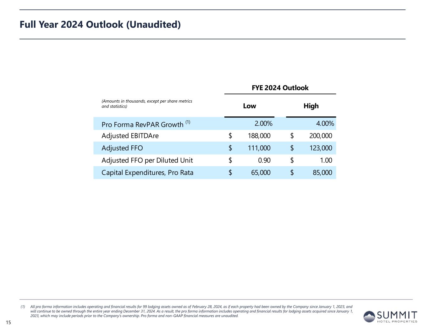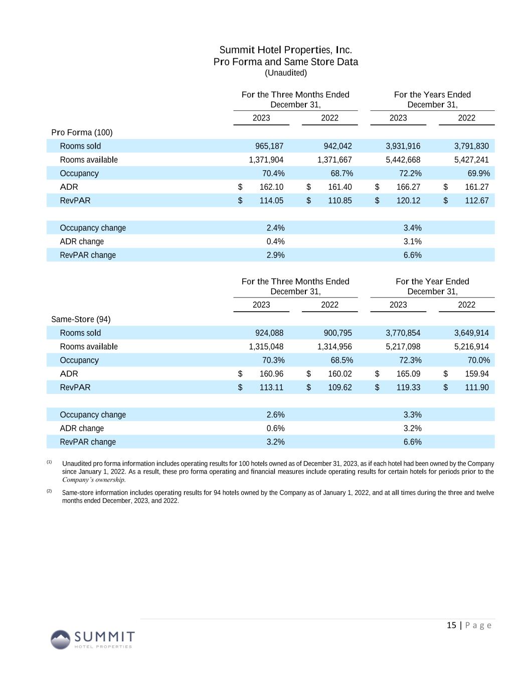 Summit Wholly-Owned GIC Joint Venture (3) Other Joint Ventures (3) Combined GIC JV Pro Rata Adj Other JVs Pro Rata Adj Pro Rata FYE 2023 FYE 2022 FYE 2023 FYE 2022 FYE 2023 FYE 2022 FYE 2023 FYE 2022 FYE 2023 FYE 2022 FYE 2023 FYE 2022 FYE 2023 FYE 2022 Net (loss) income 2,081$ (3,969)$ (30,589)$ 6,364$ 392$ (1,178)$ (28,116)$ 1,217$ 14,863 (2,439) (39) 118 (13,292)$ (1,104)$ Preferred dividends (15,875) (15,875) - - - - (15,875) (15,875) - - - - (15,875) (15,875) Distributions to and accretion of redeemable non-controlling interests (2,626) (2,520) - - - - (2,626) (2,520) - - - - (2,626) (2,520) Net loss applicable to Common Stock and Common Units (16,420)$ (22,364)$ (30,589)$ 6,364$ 392$ (1,178)$ (46,617)$ (17,178)$ 14,863$ (2,439)$ (39)$ 118$ (31,793)$ (19,499)$ Real estate-related depreciation 77,628 80,705 64,465 62,599 4,094 2,188 146,187 145,492 (31,588) (30,673) (409) (219) 114,190 114,600 Loss on write-down or impairment of assets 11,270 10,420 5,391 - - - 16,661 10,420 (2,642) - - - 14,019 10,420 Loss (gain) on disposal of assets and other dispositions, net 338 190 47 (20,505) - - 385 (20,315) (23) 10,047 - - 362 (10,268) FFO applicable to Common Stock and Common Units 72,816$ 68,951$ 39,314$ 48,458$ 4,486$ 1,010$ 116,616$ 118,419$ (19,390)$ (23,065)$ (448)$ (101)$ 96,778$ 95,253$ Recoveries of provisions for credit losses (1,230) (1,100) - - - - (1,230) (1,100) - - - - (1,230) (1,100) Amortization of deferred financing costs 3,941 3,815 1,909 1,858 60 35 5,910 5,708 (935) (910) (6) (4) 4,969 4,794 Amortization of franchise fees 274 338 321 325 - - 595 663 (157) (159) - - 438 504 Amortization of intangible assets, net (1) - 3,643 3,643 - - 3,642 3,643 (1,785) (1,785) - - 1,857 1,858 Equity-based compensation 7,742 8,446 - - - - 7,742 8,446 - - - - 7,742 8,446 Transaction costs and other 14 12 (1) 737 - - 13 749 - (361) - - 13 388 Debt transaction costs 270 1,492 125 36 - - 395 1,528 (61) (18) - - 334 1,510 Non-cash interest income (1) (531) (113) - - - - (531) (113) - - - - (531) (113) Non-cash lease expense, net 438 476 43 29 - - 481 505 (21) (14) - - 460 491 Casualty losses, net 789 2,203 1,214 302 109 - 2,112 2,505 (595) (148) (11) - 1,506 2,357 Change in deferred tax asset valuation allowance - - 84 - - - 84 - (41) - - - 43 - Special allocation related to sale of joint venture - (417) - - - - - (417) - - - - - (417) Other 447 - - - - - 447 - - (1) - - 447 (1) AFFO applicable to Common Stock and Common Units 84,969$ 84,103$ 46,652$ 55,388$ 4,655$ 1,045$ 136,276$ 140,536$ (22,985)$ (26,461)$ (465)$ (105)$ 112,826$ 113,970$ FFO per Common Stock and Common Units 0.79$ 0.79$ AFFO per Common Stock and Common Units 0.92$ 0.94$ Weighted average diluted shares of Common Stock and Common Units FFO and AFFO (2) 122,355 121,163 Reconciliation to Adjusted FFO – By Ownership Interest (Unaudited) FYE 2023 (1) Non-cash interest income relates to the amortization of the discount on certain notes receivable. The discount on these notes receivable was recorded at inception of the related loans based on the estimated value of the embedded purchase options in the notes receivable. (2) The Company includes the outstanding OP units issued by Summit Hotel OP, LP, the Company’s operating partnership, held by limited partners other than the Company because the OP units are redeemable for cash or, at the Company’s option, shares of the Company’s common stock on a one-for-one basis. (3) GIC Joint Venture is 51% owned by Summit while Other Joint Ventures are 90% owned by Summit. 14 (Amounts in thousands, except per share metrics)