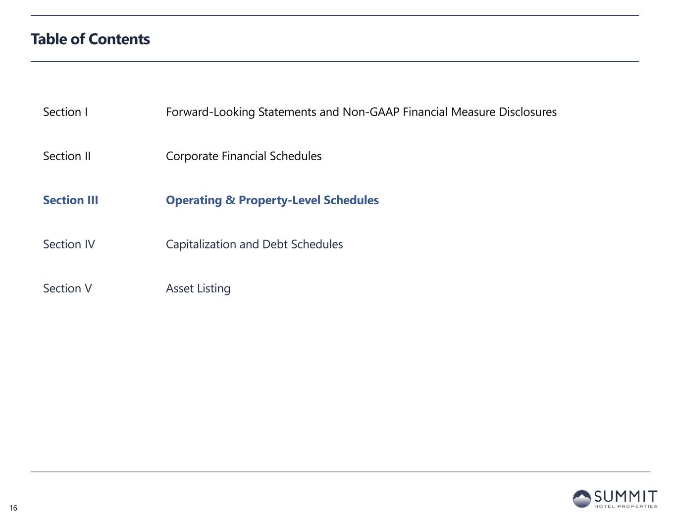 Table of Contents Section I Forward-Looking Statements and Non-GAAP Financial Measure Disclosures Section II Corporate Financial Schedules Section III Operating & Property-Level Schedules Section IV Capitalization and Debt Schedules Section V Asset Listing 16