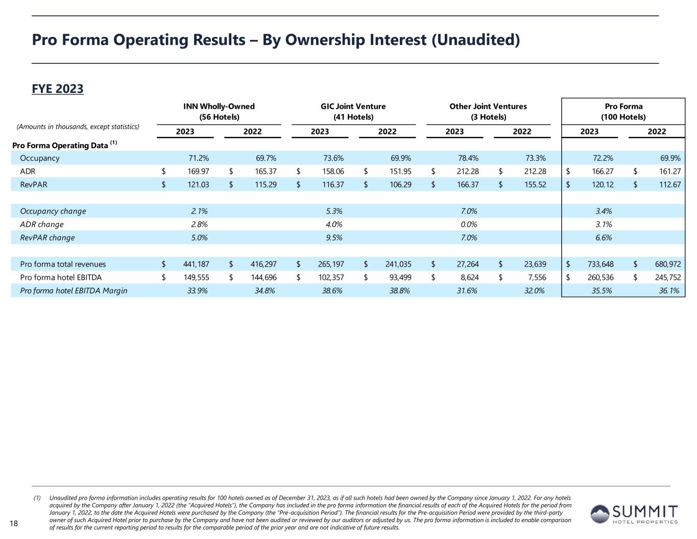 INN Wholly-Owned (56 Hotels) GIC Joint Venture (41 Hotels) Other Joint Ventures (3 Hotels) Pro Forma (100 Hotels) 2023 2022 2023 2022 2023 2022 2023 2022 Pro Forma Operating Data (1) Occupancy 68.8% 67.5% 72.3% 70.1% 81.9% 79.7% 70.4% 68.7% ADR 167.35$ 165.26$ 151.48$ 152.56$ 207.07$ 212.02$ 162.10$ 161.40$ RevPAR 115.15$ 111.51$ 109.51$ 106.93$ 169.67$ 169.08$ 114.05$ 110.85$ Occupancy change 2.0% 3.1% 2.7% 2.4% ADR change 1.3% -0.7% -2.3% 0.4% RevPAR change 3.3% 2.4% 0.3% 2.9% Pro forma total revenues 106,257$ 102,304$ 63,385$ 61,901$ 7,157$ 6,406$ 176,798$ 170,612$ Pro forma hotel EBITDA 36,167$ 34,781$ 23,501$ 25,971$ 2,695$ 2,030$ 62,363$ 62,782$ Pro forma hotel EBITDA Margin 34.0% 34.0% 37.1% 42.0% 37.7% 31.7% 35.3% 36.8% Pro Forma Operating Results – By Ownership Interest (Unaudited) (1) Unaudited pro forma information includes operating results for 100 hotels owned as of December 31, 2023, as if all such hotels had been owned by the Company since January 1, 2022. For any hotels acquired by the Company after January 1, 2022 (the “Acquired Hotels”), the Company has included in the pro forma information the financial results of each of the Acquired Hotels for the period from January 1, 2022, to the date the Acquired Hotels were purchased by the Company (the “Pre-acquisition Period”). The financial results for the Pre-acquisition Period were provided by the third-party owner of such Acquired Hotel prior to purchase by the Company and have not been audited or reviewed by our auditors or adjusted by us. The pro forma information is included to enable comparison of results for the current reporting period to results for the comparable period of the prior year and are not indicative of future results. Q4 2023 17 (Amounts in thousands, except statistics)