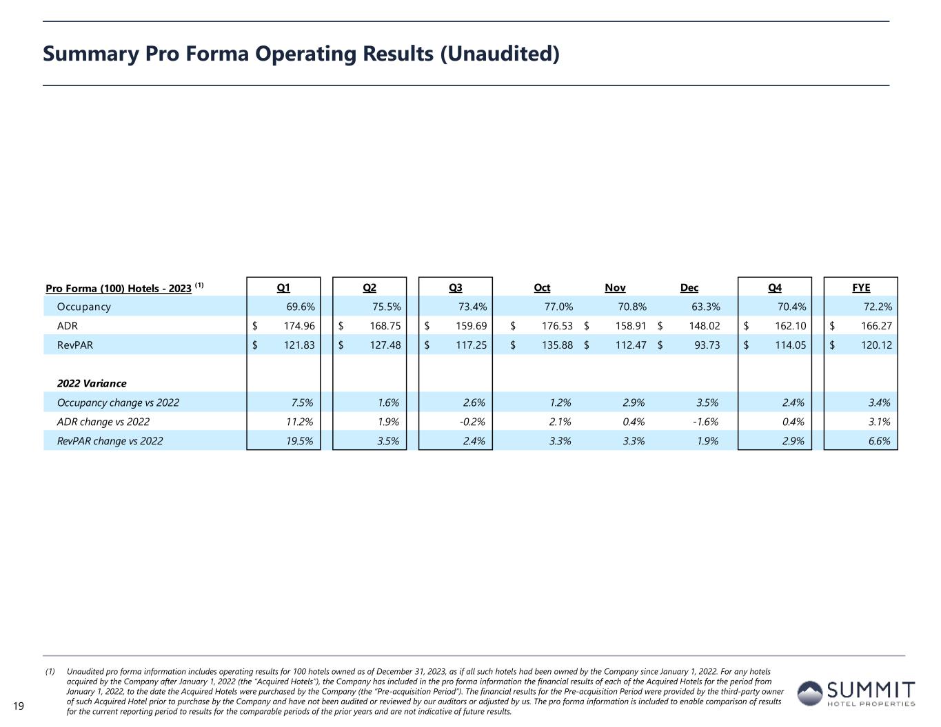 INN Wholly-Owned (56 Hotels) GIC Joint Venture (41 Hotels) Other Joint Ventures (3 Hotels) Pro Forma (100 Hotels) 2023 2022 2023 2022 2023 2022 2023 2022 Pro Forma Operating Data (1) Occupancy 71.2% 69.7% 73.6% 69.9% 78.4% 73.3% 72.2% 69.9% ADR 169.97$ 165.37$ 158.06$ 151.95$ 212.28$ 212.28$ 166.27$ 161.27$ RevPAR 121.03$ 115.29$ 116.37$ 106.29$ 166.37$ 155.52$ 120.12$ 112.67$ Occupancy change 2.1% 5.3% 7.0% 3.4% ADR change 2.8% 4.0% 0.0% 3.1% RevPAR change 5.0% 9.5% 7.0% 6.6% Pro forma total revenues 441,187$ 416,297$ 265,197$ 241,035$ 27,264$ 23,639$ 733,648$ 680,972$ Pro forma hotel EBITDA 149,555$ 144,696$ 102,357$ 93,499$ 8,624$ 7,556$ 260,536$ 245,752$ Pro forma hotel EBITDA Margin 33.9% 34.8% 38.6% 38.8% 31.6% 32.0% 35.5% 36.1% Pro Forma Operating Results – By Ownership Interest (Unaudited) (1) Unaudited pro forma information includes operating results for 100 hotels owned as of December 31, 2023, as if all such hotels had been owned by the Company since January 1, 2022. For any hotels acquired by the Company after January 1, 2022 (the “Acquired Hotels”), the Company has included in the pro forma information the financial results of each of the Acquired Hotels for the period from January 1, 2022, to the date the Acquired Hotels were purchased by the Company (the “Pre-acquisition Period”). The financial results for the Pre-acquisition Period were provided by the third-party owner of such Acquired Hotel prior to purchase by the Company and have not been audited or reviewed by our auditors or adjusted by us. The pro forma information is included to enable comparison of results for the current reporting period to results for the comparable period of the prior year and are not indicative of future results. FYE 2023 18 (Amounts in thousands, except statistics)