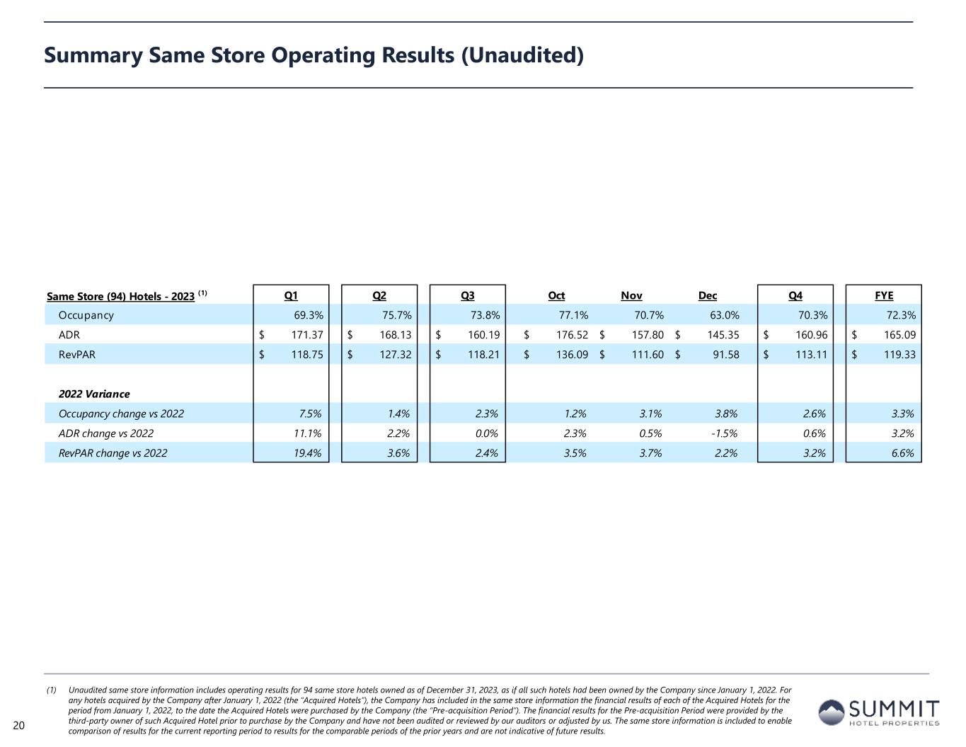 Pro Forma (100) Hotels - 2023 (1) Q1 Q2 Q3 Oct Nov Dec Q4 FYE Occupancy 69.6% 75.5% 73.4% 77.0% 70.8% 63.3% 70.4% 72.2% ADR 174.96$ 168.75$ 159.69$ 176.53$ 158.91$ 148.02$ 162.10$ 166.27$ RevPAR 121.83$ 127.48$ 117.25$ 135.88$ 112.47$ 93.73$ 114.05$ 120.12$ 2022 Variance Occupancy change vs 2022 7.5% 1.6% 2.6% 1.2% 2.9% 3.5% 2.4% 3.4% ADR change vs 2022 11.2% 1.9% -0.2% 2.1% 0.4% -1.6% 0.4% 3.1% RevPAR change vs 2022 19.5% 3.5% 2.4% 3.3% 3.3% 1.9% 2.9% 6.6% Summary Pro Forma Operating Results (Unaudited) (1) Unaudited pro forma information includes operating results for 100 hotels owned as of December 31, 2023, as if all such hotels had been owned by the Company since January 1, 2022. For any hotels acquired by the Company after January 1, 2022 (the “Acquired Hotels”), the Company has included in the pro forma information the financial results of each of the Acquired Hotels for the period from January 1, 2022, to the date the Acquired Hotels were purchased by the Company (the “Pre-acquisition Period”). The financial results for the Pre-acquisition Period were provided by the third-party owner of such Acquired Hotel prior to purchase by the Company and have not been audited or reviewed by our auditors or adjusted by us. The pro forma information is included to enable comparison of results for the current reporting period to results for the comparable periods of the prior years and are not indicative of future results. 19