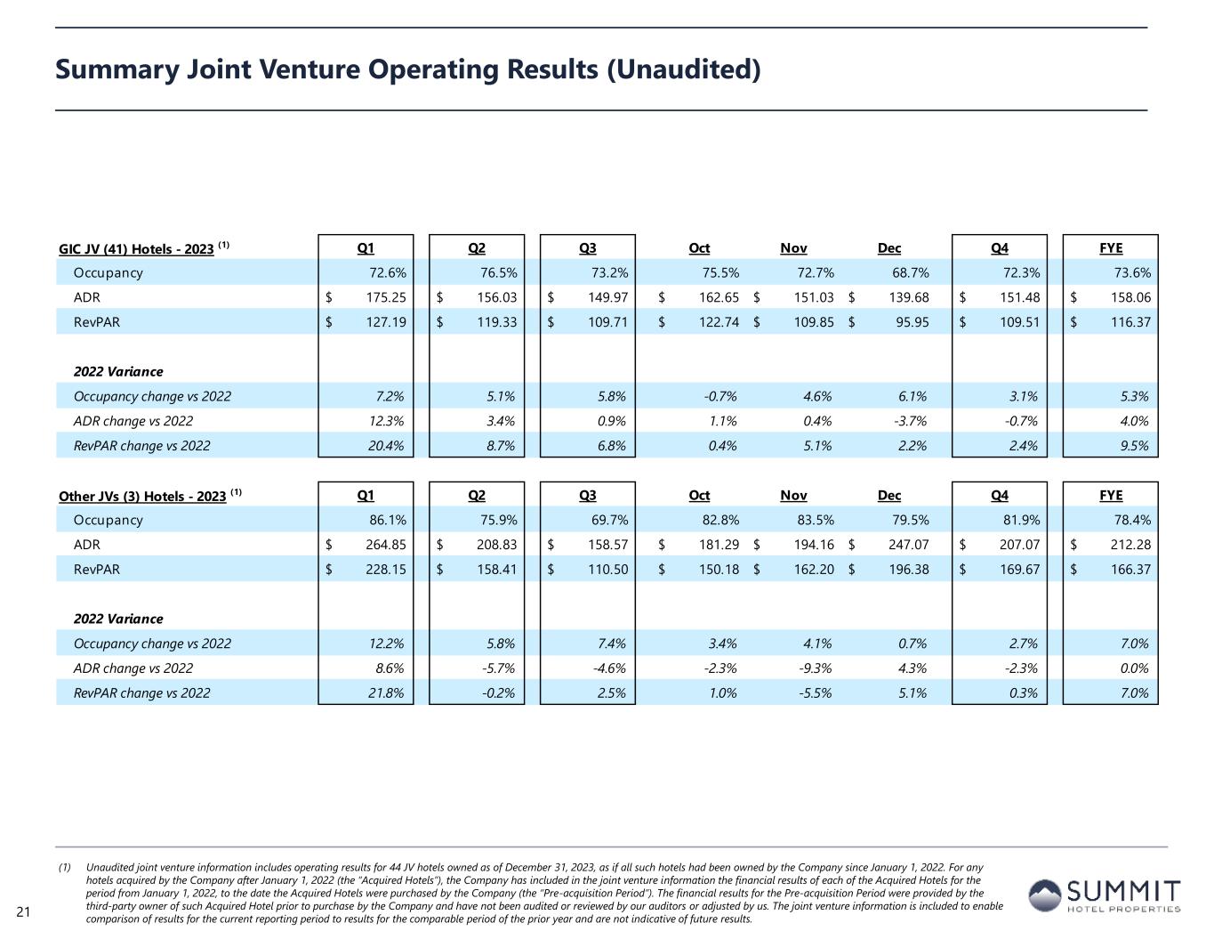 GIC JV (41) Hotels - 2023 (1) Q1 Q2 Q3 Oct Nov Dec Q4 FYE Occupancy 72.6% 76.5% 73.2% 75.5% 72.7% 68.7% 72.3% 73.6% ADR 175.25$ 156.03$ 149.97$ 162.65$ 151.03$ 139.68$ 151.48$ 158.06$ RevPAR 127.19$ 119.33$ 109.71$ 122.74$ 109.85$ 95.95$ 109.51$ 116.37$ 2022 Variance Occupancy change vs 2022 7.2% 5.1% 5.8% -0.7% 4.6% 6.1% 3.1% 5.3% ADR change vs 2022 12.3% 3.4% 0.9% 1.1% 0.4% -3.7% -0.7% 4.0% RevPAR change vs 2022 20.4% 8.7% 6.8% 0.4% 5.1% 2.2% 2.4% 9.5% Other JVs (3) Hotels - 2023 (1) Q1 Q2 Q3 Oct Nov Dec Q4 FYE Occupancy 86.1% 75.9% 69.7% 82.8% 83.5% 79.5% 81.9% 78.4% ADR 264.85$ 208.83$ 158.57$ 181.29$ 194.16$ 247.07$ 207.07$ 212.28$ RevPAR 228.15$ 158.41$ 110.50$ 150.18$ 162.20$ 196.38$ 169.67$ 166.37$ 2022 Variance Occupancy change vs 2022 12.2% 5.8% 7.4% 3.4% 4.1% 0.7% 2.7% 7.0% ADR change vs 2022 8.6% -5.7% -4.6% -2.3% -9.3% 4.3% -2.3% 0.0% RevPAR change vs 2022 21.8% -0.2% 2.5% 1.0% -5.5% 5.1% 0.3% 7.0% Summary Joint Venture Operating Results (Unaudited) (1) Unaudited joint venture information includes operating results for 44 JV hotels owned as of December 31, 2023, as if all such hotels had been owned by the Company since January 1, 2022. For any hotels acquired by the Company after January 1, 2022 (the “Acquired Hotels”), the Company has included in the joint venture information the financial results of each of the Acquired Hotels for the period from January 1, 2022, to the date the Acquired Hotels were purchased by the Company (the “Pre-acquisition Period”). The financial results for the Pre-acquisition Period were provided by the third-party owner of such Acquired Hotel prior to purchase by the Company and have not been audited or reviewed by our auditors or adjusted by us. The joint venture information is included to enable comparison of results for the current reporting period to results for the comparable period of the prior year and are not indicative of future results. 21