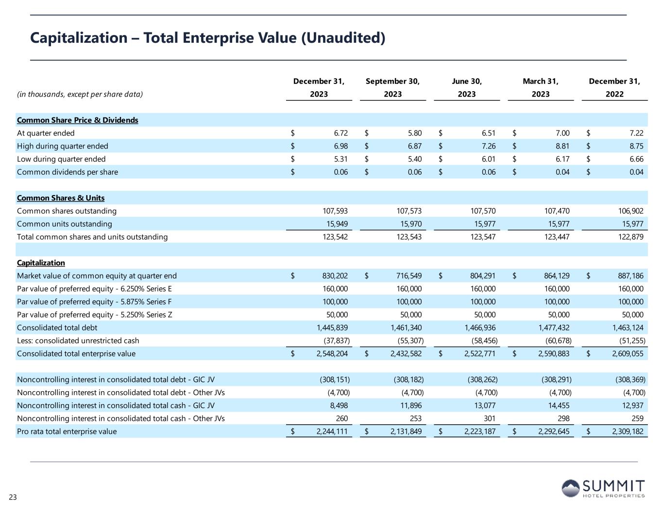 December 31, September 30, June 30, March 31, December 31, (in thousands, except per share data) 2023 2023 2023 2023 2022 Common Share Price & Dividends At quarter ended 6.72$ 5.80$ 6.51$ 7.00$ 7.22$ High during quarter ended 6.98$ 6.87$ 7.26$ 8.81$ 8.75$ Low during quarter ended 5.31$ 5.40$ 6.01$ 6.17$ 6.66$ Common dividends per share 0.06$ 0.06$ 0.06$ 0.04$ 0.04$ Common Shares & Units Common shares outstanding 107,593 107,573 107,570 107,470 106,902 Common units outstanding 15,949 15,970 15,977 15,977 15,977 Total common shares and units outstanding 123,542 123,543 123,547 123,447 122,879 Capitalization Market value of common equity at quarter end 830,202$ 716,549$ 804,291$ 864,129$ 887,186$ Par value of preferred equity - 6.250% Series E 160,000 160,000 160,000 160,000 160,000 Par value of preferred equity - 5.875% Series F 100,000 100,000 100,000 100,000 100,000 Par value of preferred equity - 5.250% Series Z 50,000 50,000 50,000 50,000 50,000 Consolidated total debt 1,445,839 1,461,340 1,466,936 1,477,432 1,463,124 Less: consolidated unrestricted cash (37,837) (55,307) (58,456) (60,678) (51,255) Consolidated total enterprise value 2,548,204$ 2,432,582$ 2,522,771$ 2,590,883$ 2,609,055$ Noncontrolling interest in consolidated total debt - GIC JV (308,151) (308,182) (308,262) (308,291) (308,369) Noncontrolling interest in consolidated total debt - Other JVs (4,700) (4,700) (4,700) (4,700) (4,700) Noncontrolling interest in consolidated total cash - GIC JV 8,498 11,896 13,077 14,455 12,937 Noncontrolling interest in consolidated total cash - Other JVs 260 253 301 298 259 Pro rata total enterprise value 2,244,111$ 2,131,849$ 2,223,187$ 2,292,645$ 2,309,182$ Capitalization – Total Enterprise Value (Unaudited) 23